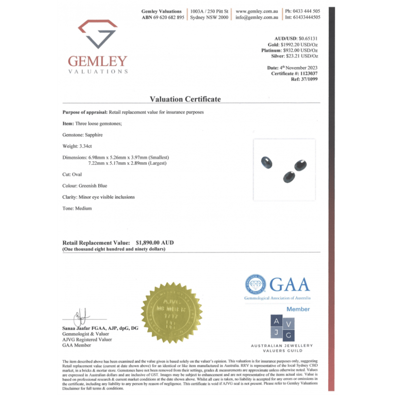 3.34CT TSW X 3, NATURAL GREEN CORUNDUM SAPPHIRES, OVAL CUT, MEDIUM GREENISH-BLUE, MINOR EYE VISIBLE INCLUSIONS, LOOSE, UNSET. Valuations Provided by an Independent Third-Party Professional Not Directly Associated With Lloyds Auctions at AUD $1890This valuation has been conducted by an independent third-party professional. The valuation amount is an assessment by the issuing valuer and does not reflect the auction value of the item. Any inquiries regarding the valuation should be directed to the issuing valuer (refer to contact details on the certificate), as Lloyds Auctions has no affiliation or influence over the valuation, the valuer, or the stated amount. Condition: Good - Refer Images 0+2382