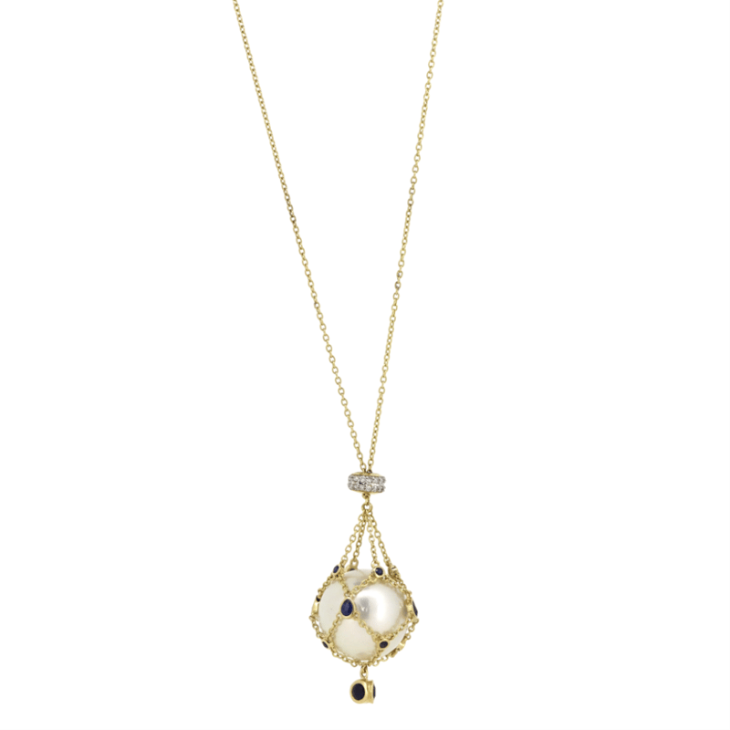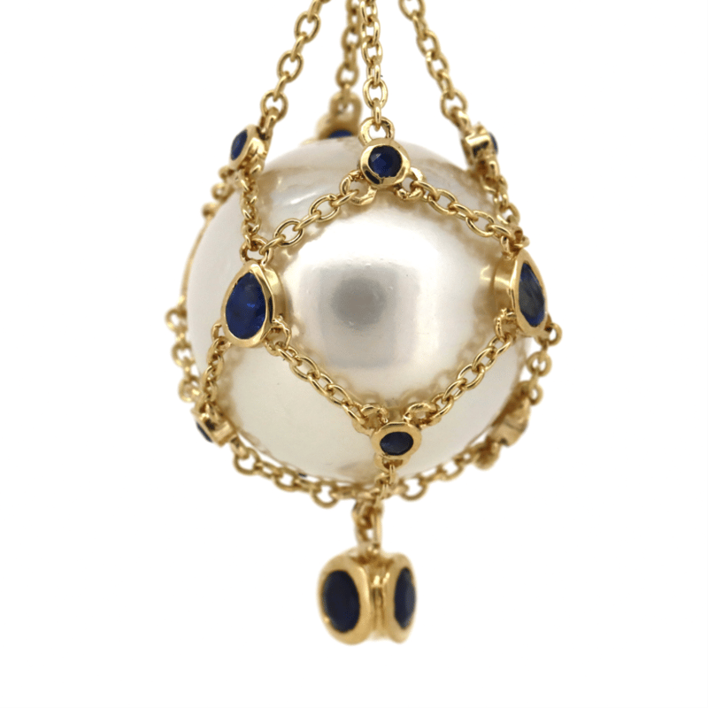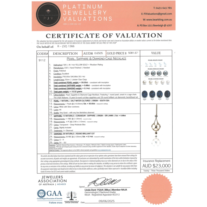 14K YELLOW GOLD, WHITE CULTURED SOUTH SEA PEARL, BLUE SAPPHIRE AND DIAMOND, CAGE NECKLACE. THE DESIGN FEATURES, ONE ROUND, WHITE WITH SILVER OVERTONES, CULTURED SOUTH SEA PEARL (16.00MM SIZE, AA LUSTRE, VERY FEW BLEMISHES), UNSET IN "CAGE" STYLE CHAIN. THE DESIGN FEATURES, 15 PEAR/ROUND CUT, DEEP MODERATE BLUE, SAPPHIRES (0.88CT TSW, SLIGHTLY INCLUDED, ENHANCED), BEZEL SET. EMBELLISHING THE DESIGN ARE, 28 ROUND BRILLIANT CUT, DIAMONDS (0.14CT TDW, G-H COLOUR, SI1-SI2 CLARITY), BEZEL/BEAD SET. THE NECKLACE HAS A LOBSTER CLAW CLASP. NECKLACE LENGTH IS 50CM. Valuations Provided by an Independent Third-Party Professional Not Directly Associated With Lloyds Auctions at AUD $23000This valuation has been conducted by an independent third-party professional. The valuation amount is an assessment by the issuing valuer and does not reflect the auction value of the item. Any inquiries regarding the valuation should be directed to the issuing valuer (refer to contact details on the certificate), as Lloyds Auctions has no affiliation or influence over the valuation, the valuer, or the stated amount. Condition: Good - Refer Images 0645860+13
