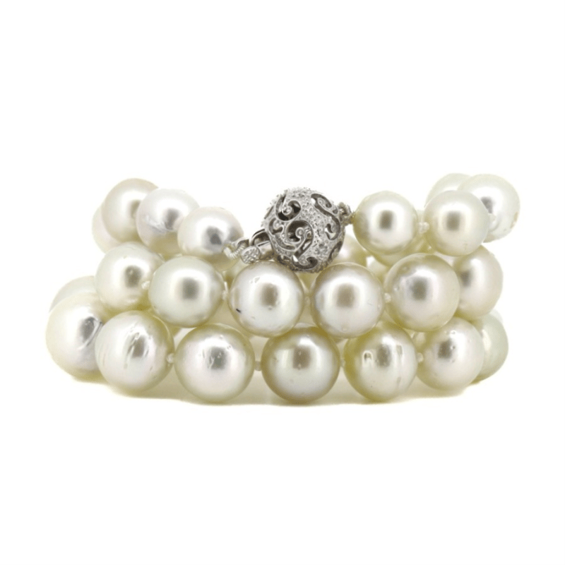 14K WHITE GOLD, WHITE CULTURED SOUTH SEA PEARL AND DIAMOND, STRAND NECKLACE. THE DESIGN FEATURES, 39 NEAR ROUND, WHITE WITH SILVER/GOLD OVERTONES, CULTURED SOUTH SEA PEARLS (8.800MM-12.60MM SIZE, GOOD LUSTRE, LIGHT-MEDIUM NATURAL BLEMISHES). EMBELLISHING THE 14K WHITE GOLD FILIGREE BALL CLASP ARE, 4 ROUND BRILLIANT CUT, DIAMONDS (0.05CT TDW, G-H COLOUR, SI CLARITY), BEAD SET. NECKLACE LENGTH IS 45.5CM. Valuations Provided by an Independent Third-Party Professional Not Directly Associated With Lloyds Auctions at AUD $14500This valuation has been conducted by an independent third-party professional. The valuation amount is an assessment by the issuing valuer and does not reflect the auction value of the item. Any inquiries regarding the valuation should be directed to the issuing valuer (refer to contact details on the certificate), as Lloyds Auctions has no affiliation or influence over the valuation, the valuer, or the stated amount. Condition: Good - Refer Images 0645860+81