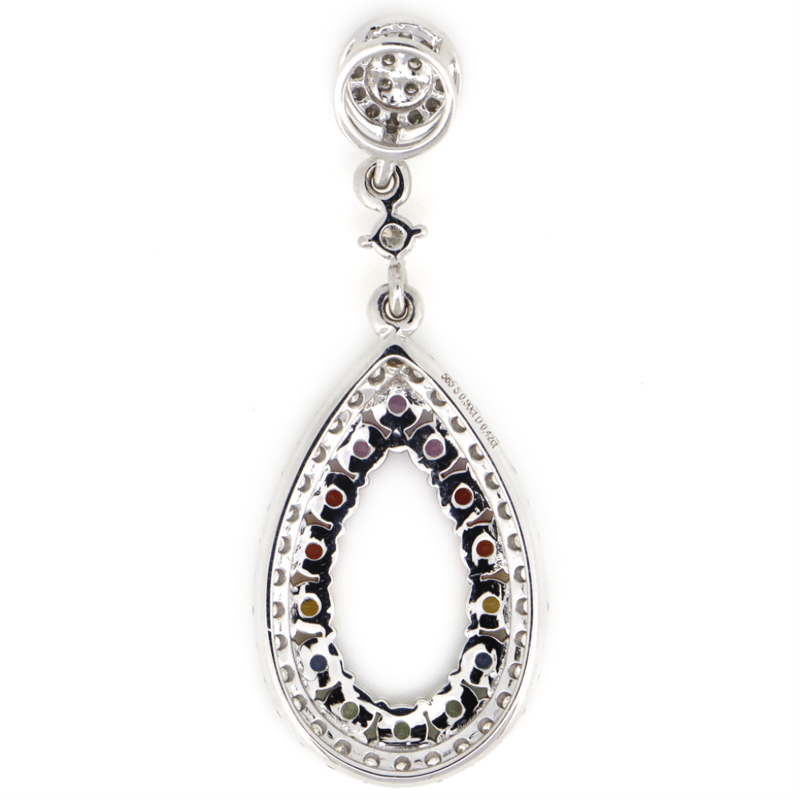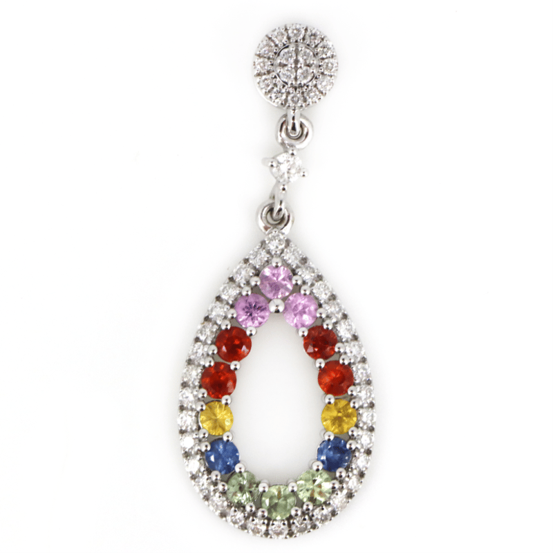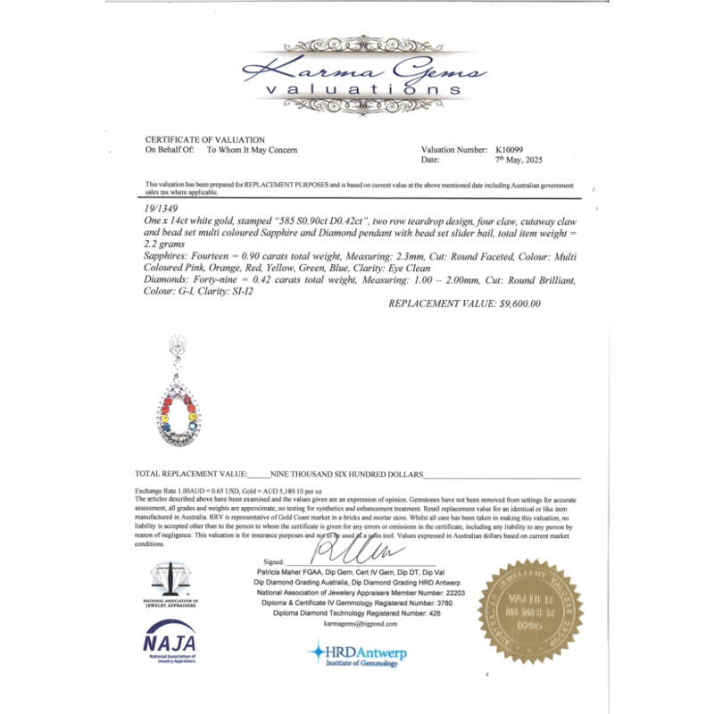 14K WHITE GOLD, MULTI-COLOURED SAPPHIRE AND DIAMOND, PENDANT. THE DESIGN FEATURES, 14 ROUND FACETED CUT, PINK, GREEN, BLUE, YELLOW, ORANGE AND RED, SAPPHIRES (0.90CT TSW, EYE CLEAN CLARITY), 4 CLAW SET. SURROUNDING THE SAPPHIRES IN A HALO AND DECORATING THE DROP ARE, 49 ROUND BRILLIANT CUT, DIAMONDS (0.42CT TDW, G-I COLOUR, SI-I2 CLARITY), CUTAWAY CLAW/BEAD SET. Valuations Provided by an Independent Third-Party Professional Not Directly Associated With Lloyds Auctions at AUD $9600This valuation has been conducted by an independent third-party professional. The valuation amount is an assessment by the issuing valuer and does not reflect the auction value of the item. Any inquiries regarding the valuation should be directed to the issuing valuer (refer to contact details on the certificate), as Lloyds Auctions has no affiliation or influence over the valuation, the valuer, or the stated amount. Condition: Good - Refer Images 0645860+26