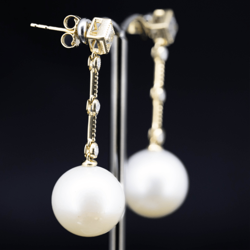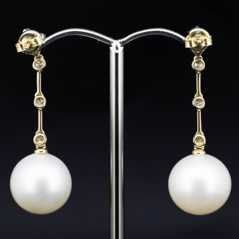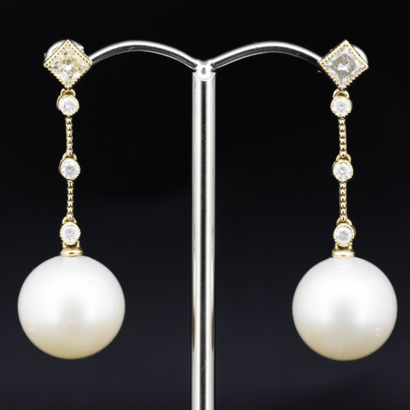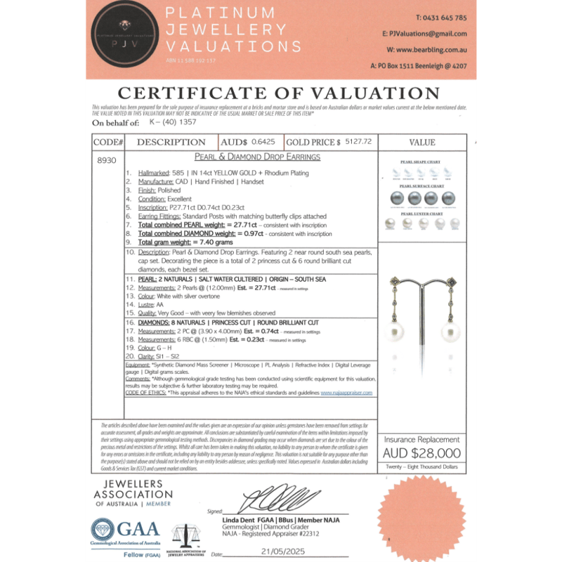 14K YELLOW GOLD, WHITE CULTURED SOUTH SEA PEARL AND DIAMOND, DROP EARRINGS. THE DESIGN FEATURES, 2 NEAR ROUND, WHITE WITH SILVER OVERTONE, CULTURED SOUTH SEA PEARLS (12.00MM SIZE, AA LUSTRE, VERY FEW BLEMISHES), POST SET. EMBELLISHING THE DESIGN ARE, 6 ROUND BRILLIANT CUT, DIAMONDS (0.23CT TDW, G-H COLOUR, SI1-SI2 CLARITY), BEZEL SET. DECORATING THE STUDS ARE, 2 PRINCESS CUT, DIAMONDS (0.74CT TDW, G-H COLOUR, SI1-SI2 CLARITY), BEZEL SET. THE EARRINGS HAVE 14CT YELLOW GOLD, POST AND MATCHING BUTTERFLY CLASPS. Valuations Provided by an Independent Third-Party Professional Not Directly Associated With Lloyds Auctions at AUD $28000This valuation has been conducted by an independent third-party professional. The valuation amount is an assessment by the issuing valuer and does not reflect the auction value of the item. Any inquiries regarding the valuation should be directed to the issuing valuer (refer to contact details on the certificate), as Lloyds Auctions has no affiliation or influence over the valuation, the valuer, or the stated amount. Condition: Good - Refer Images 0645860+100