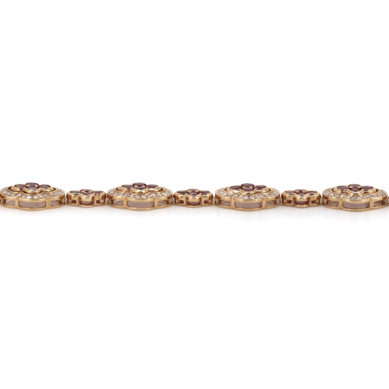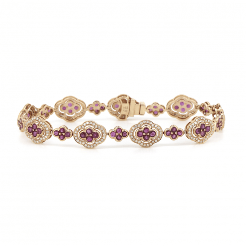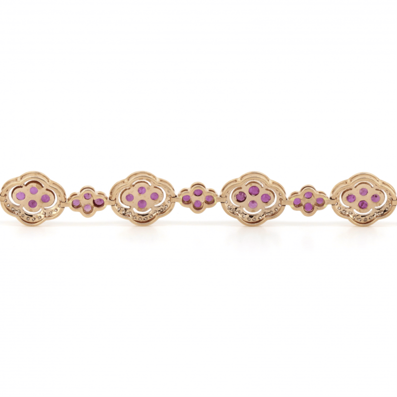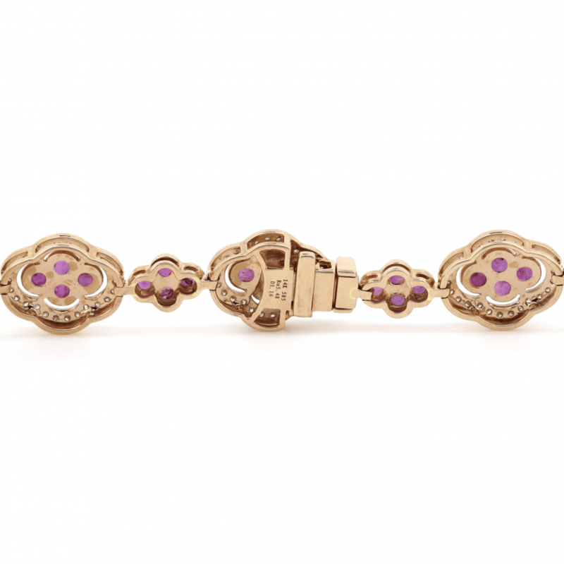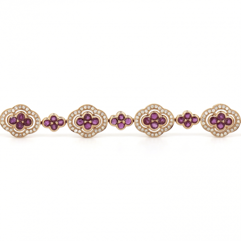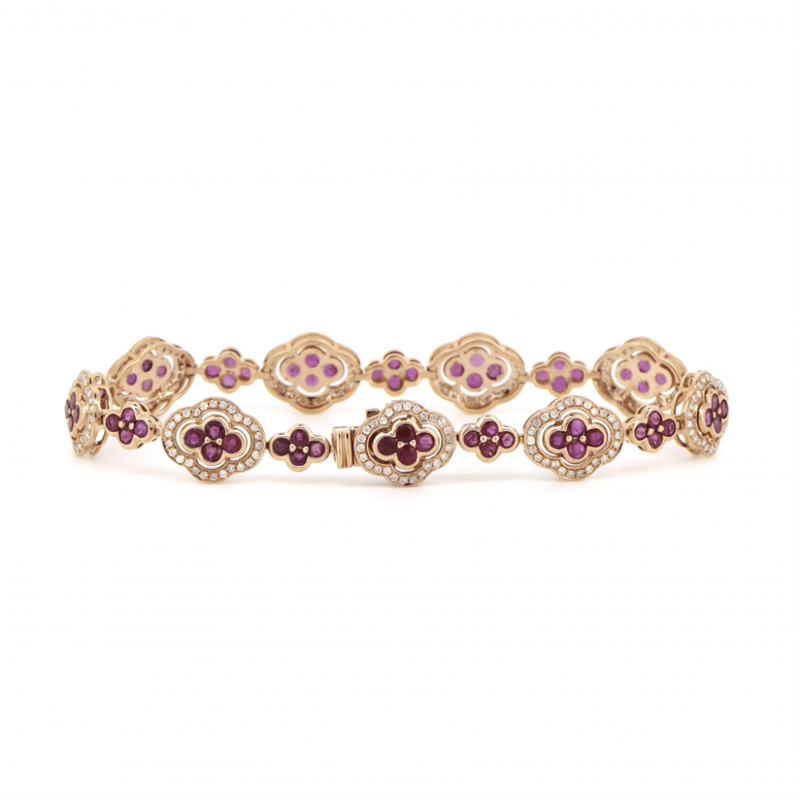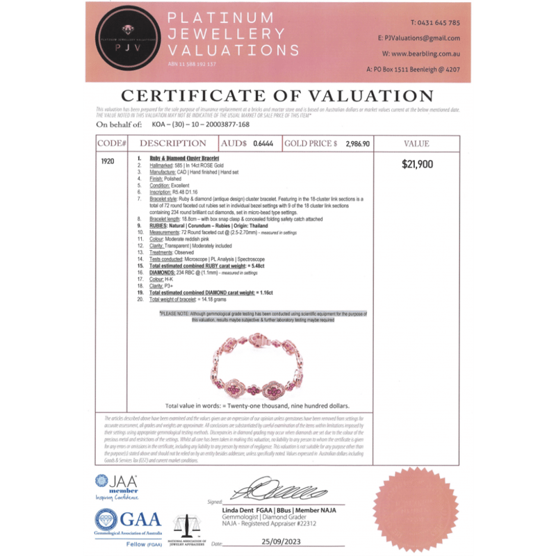 14K ROSE GOLD, RUBY AND DIAMOND, VINTAGE INSPIRED BRACELET. THE DESIGN FEATURES, 72 ROUND FACETED CUT, MODERATE PINKISH-RED, RUBIES (5.48CT TSW, MODERATELY INCLUDED, ENHANCED), BEZEL SET. DECORATING THE DESIGN ARE, 234 ROUND BRILLIANT CUT, DIAMONDS (1.16CT TDW, H-K COLOUR, P3+ CLARITY), MICRO-BEAD SET. THE BRACELET HAS A BOX LOCK CLASP, WITH ONE SAFETY LATCH. BRACELET LENGTH IS 18.5CM. Valuations Provided by an Independent Third-Party Professional Not Directly Associated With Lloyds Auctions at AUD $21900This valuation has been conducted by an independent third-party professional. The valuation amount is an assessment by the issuing valuer and does not reflect the auction value of the item. Any inquiries regarding the valuation should be directed to the issuing valuer (refer to contact details on the certificate), as Lloyds Auctions has no affiliation or influence over the valuation, the valuer, or the stated amount. Condition: Good - Refer Images 0645860+30