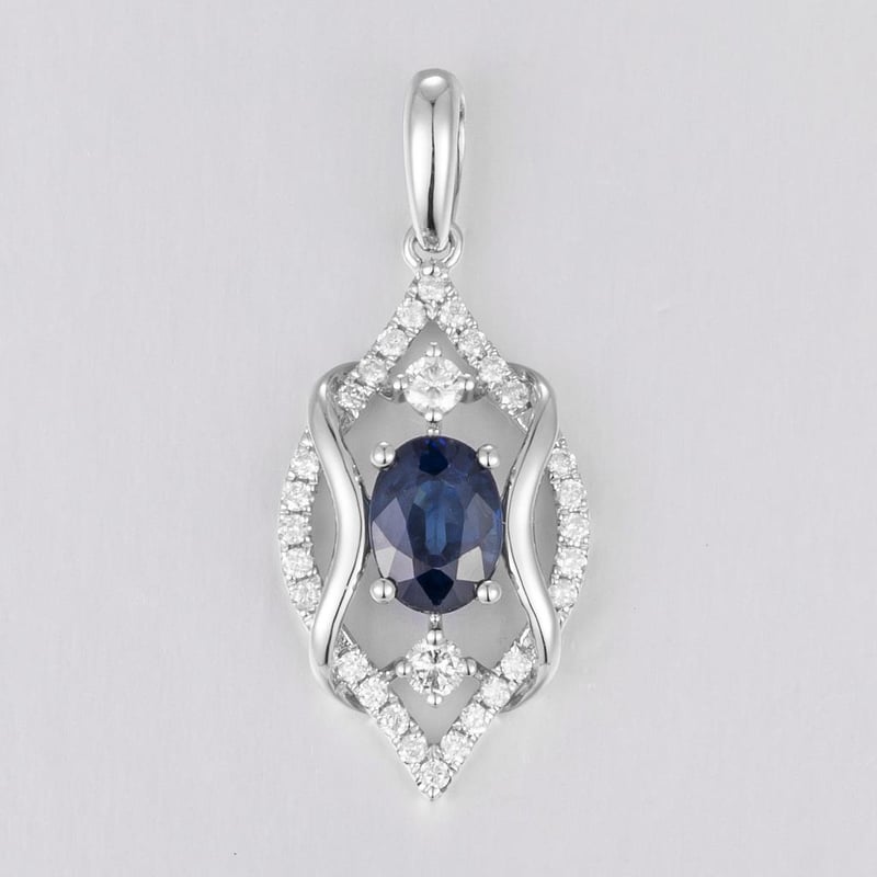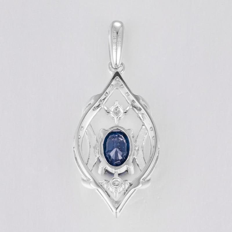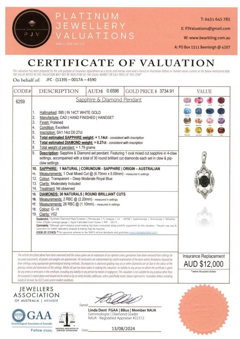 14CT WHITE GOLD AUSTRALIAN SAPPHIRE AND DIAMOND ANTIQUE STYLE PENDANT FEATURING CENTRE, ONE OVAL CUT, DEEP MODERATE ROYAL BLUE AUSTRALIAN SAPPHIRE (1.14CT, MODERATELY INCLUDED), CLAW SET, WITH 30 ROUND BRILLIANT CUT DIAMONDS (0.27CT TDW, G-H COLOUR, VS2 CLARITY), BEAD SET. Valuations Provided by an Independent Third-Party Professional Not Directly Associated With Lloyds Auctions at AUD $12000This valuation has been conducted by an independent third-party professional. The valuation amount is an assessment by the issuing valuer and does not reflect the auction value of the item. Any inquiries regarding the valuation should be directed to the issuing valuer (refer to contact details on the certificate), as Lloyds Auctions has no affiliation or influence over the valuation, the valuer, or the stated amount. Condition: Good - Refer Images 0586199+1324