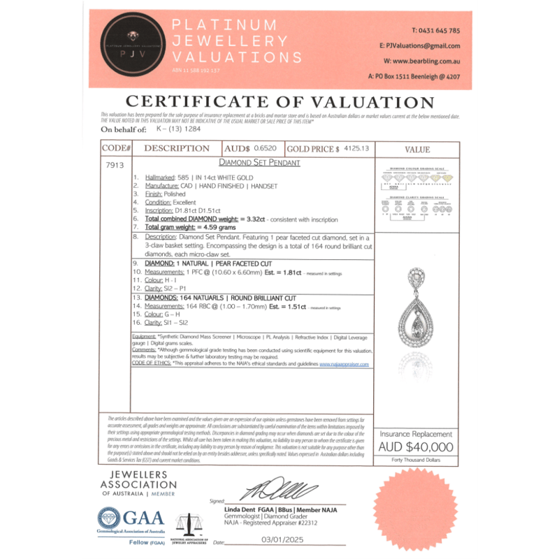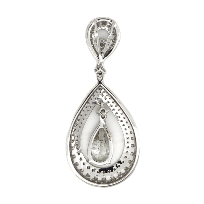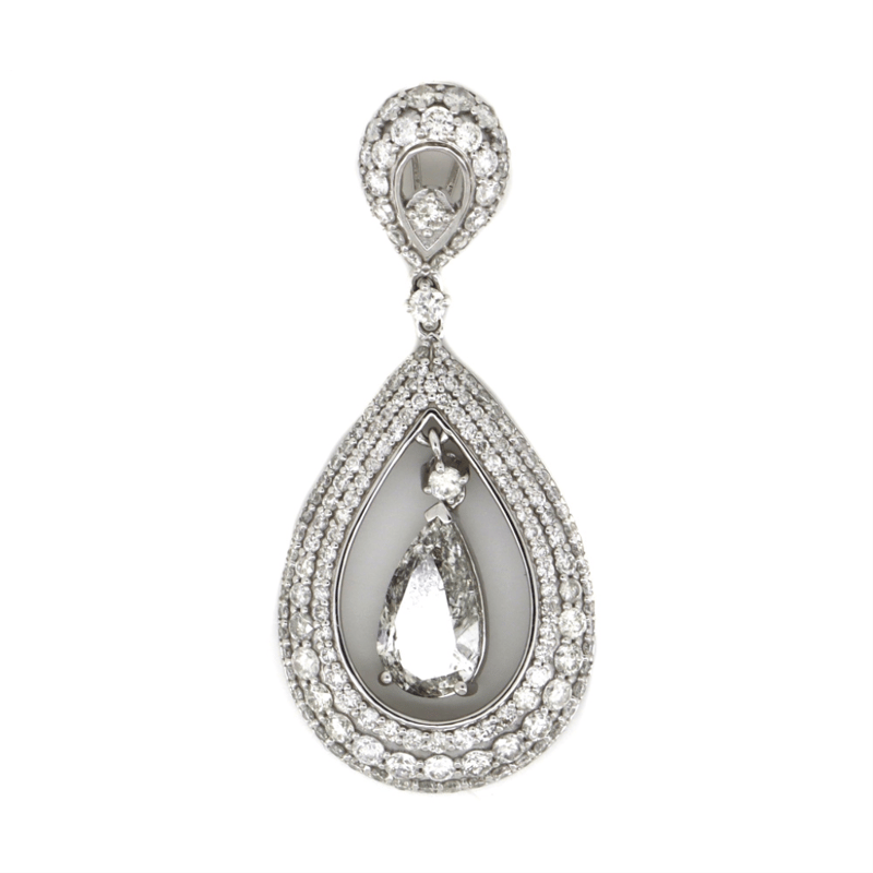 14K WHITE GOLD AND DIAMOND, DECORATIVE PENDANT. THE CENTRE FEATURES, ONE PEAR FACETED CUT, DIAMOND (1.81CT, H-I COLOUR, SI2-P1 CLARITY), 3 CLAW SET. ENCOMPASSING THE DESIGN ARE, 164 ROUND BRILLIANT CUT, DIAMONDS (1.51CT TDW, G-H COLOUR, SI1-SI2 CLARITY), MICRO-CLAW SET.