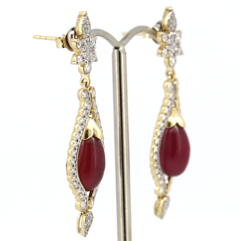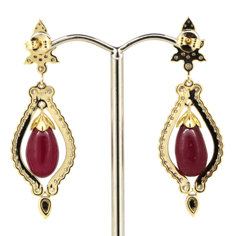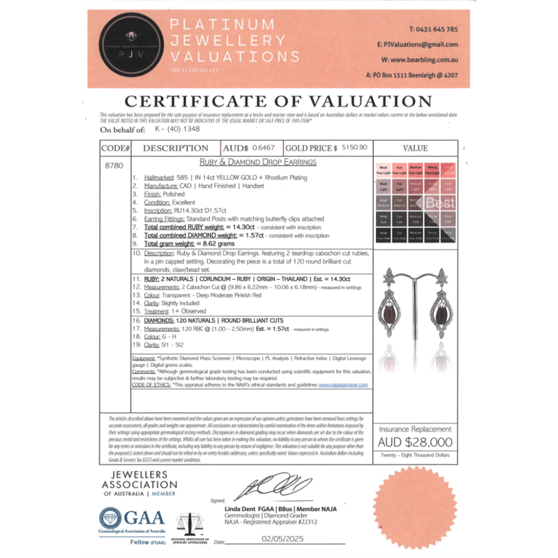 14K YELLOW GOLD, RUBY AND DIAMOND, DROP EARRINGS. THE CENTRES FEATURE, 2 CABOCHON CUT, DEEP MODERATE RED, RUBIES (14.30CT TSW, SLIGHTLY INCLUDED), PIN CAPPED SETTING. DECORATING THE BAIL AND THE HOOKS ARE, 120 ROUND BRILLIANT CUT, DIAMONDS (1.57CT TDW, G-H COLOUR, SI1-SI2 CLARITY), CLAW/BEAD SET. Valuations Provided by an Independent Third-Party Professional Not Directly Associated With Lloyds Auctions at AUD $28000This valuation has been conducted by an independent third-party professional. The valuation amount is an assessment by the issuing valuer and does not reflect the auction value of the item. Any inquiries regarding the valuation should be directed to the issuing valuer (refer to contact details on the certificate), as Lloyds Auctions has no affiliation or influence over the valuation, the valuer, or the stated amount. Condition: Good - Refer Images 0645863+5012