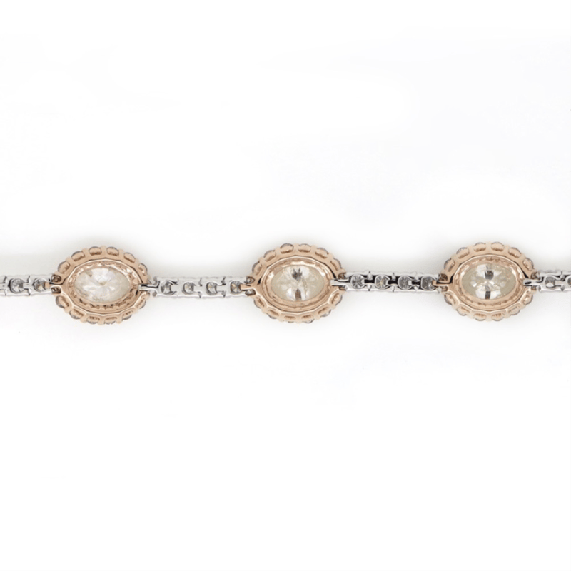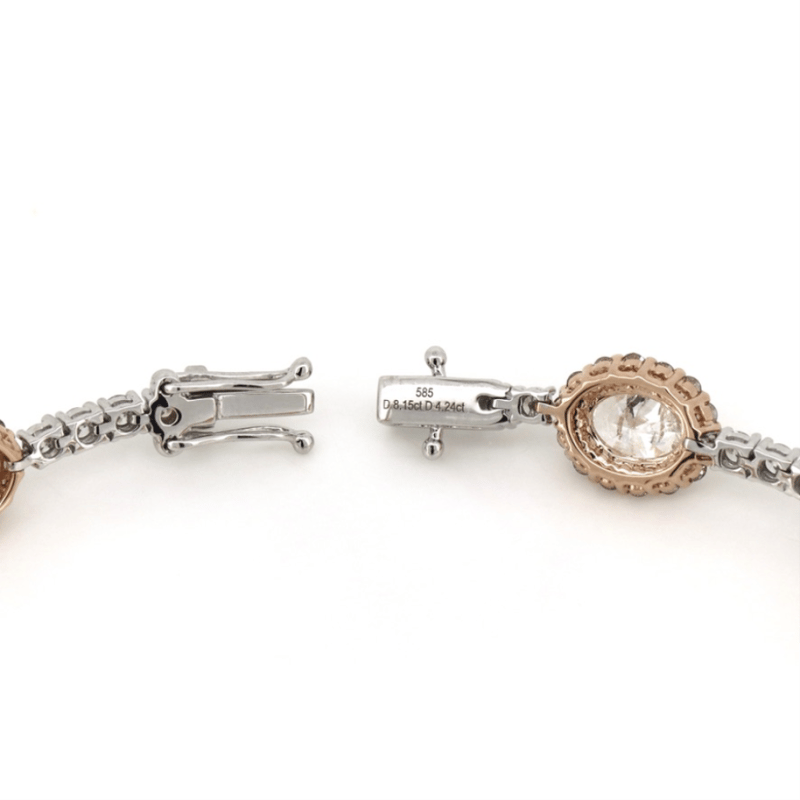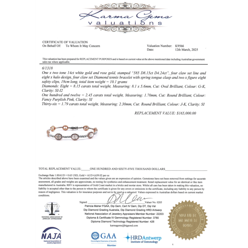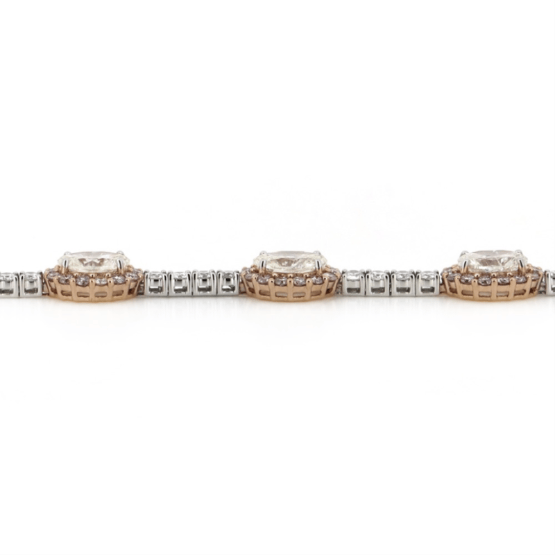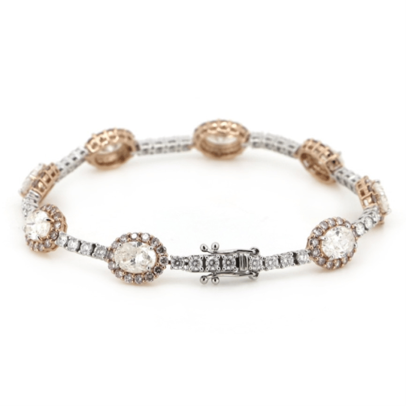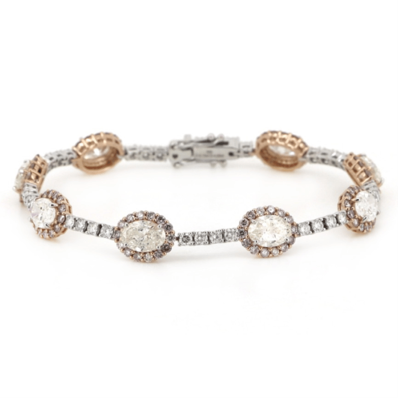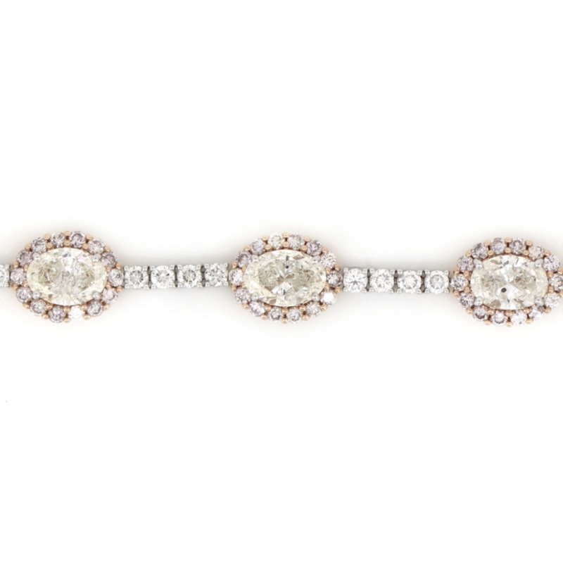 14 WHITE/ROSE GOLD, FANCY PINK DIAMOND AND DIAMOND, HALO LINE BRACELET. THE DESIGN FEATURES, 8 OVAL BRILLIANT CUT, DIAMONDS (8.15CT TDW, G-K COLOUR, SI-I2 CLARITY), 4 CLAW SET. ACCOMPANIED BY, 112 ROUND BRILLIANT CUT, FANCY PURPLISH-PINK, DIAMONDS (2.45CT TDW, SI CLARITY), CLAW SET. ENCOMPASSING THE DESIGN ARE, 36 ROUND BRILLIANT CUT, DIAMONDS (1.79CT TDW, J-K COLOUR, SI CLARITY), INDIVIDUALLY BEADED BEZEL SET. THE BRACELET HAS A BOX SNAP WITH A DOUBLE FIGURE '8' SAFETY LATCH. BRACELET LENGTH IS 18CM.