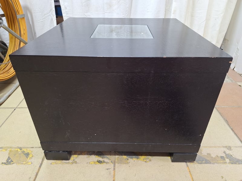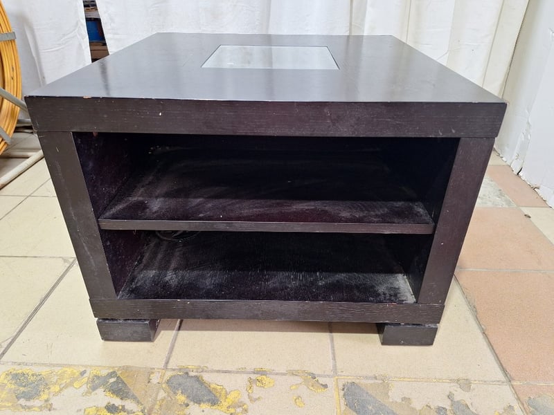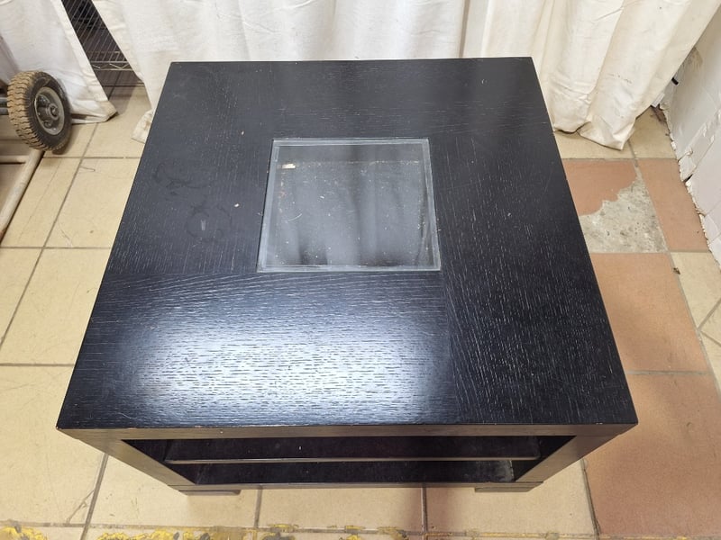 Coffee Table With Glass Top, Shelves On Each Side, Timber Style, Black Finish Dimensions H:49cm W:65cm D:65cm