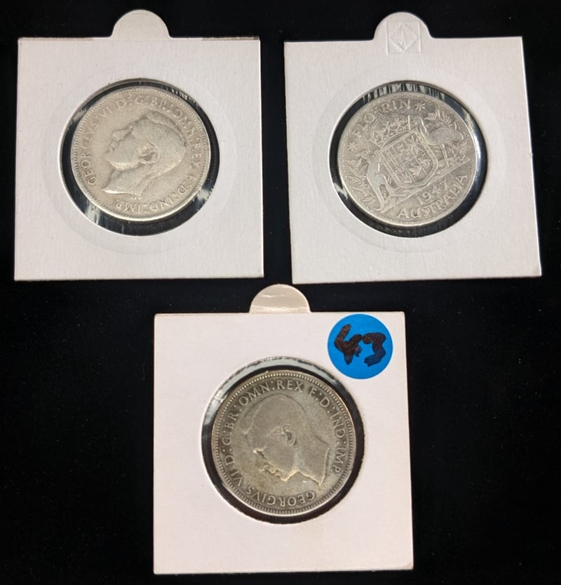 3 SILVER COINS, 1946 AND 1947 AUSTRALIAN FLORIN COINS. QTY 3 Item Size: Height: 5cm, Width: 5cm, Depth: 5cm, Weight: 0.5Kg Condition: Good - Refer To Images FC 162976+9