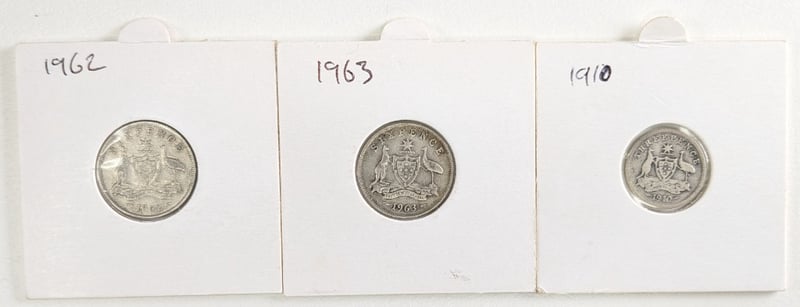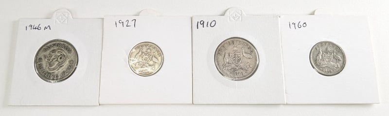 7 AUSTRALIAN SILVER COINS. 1962 SIX PENCE, 1963 SIX PENCE, 1927 SIX PENCE, 1910 SIX PENCE, 1960 SIX PENCE, 1910 SHILLING AND 1946 SHILLING. Item Size: Height: 1cm, Width: 1cm, Depth: 1cm, Weight: 0.5Kg Condition: Good - Refer To Images FC 162976+11