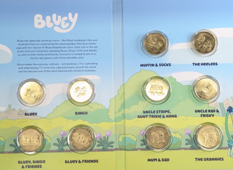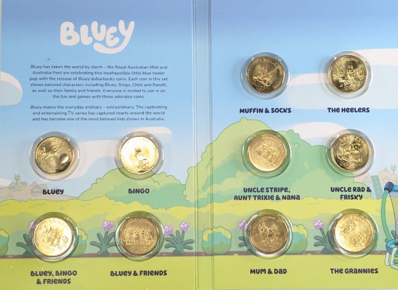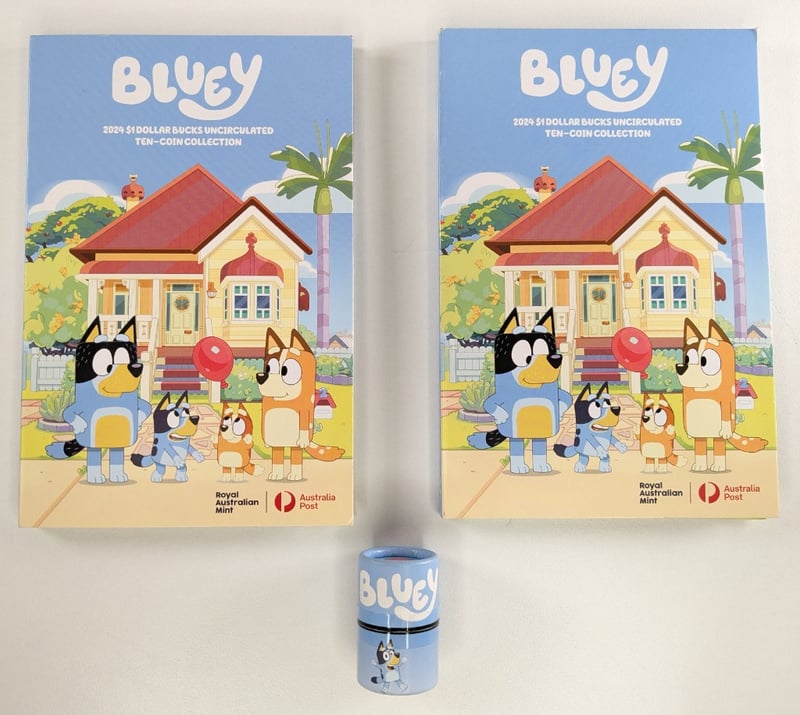 BLUEY UNCIRCULATED TEN-COIN COLLECTION 2024. 2 SETS OF 10, QTY 20 COINS Item Size: Height: 10cm, Width: 5cm, Depth: 2cm, Weight: 1Kg Condition: Good - Refer To Images FC 162976+4