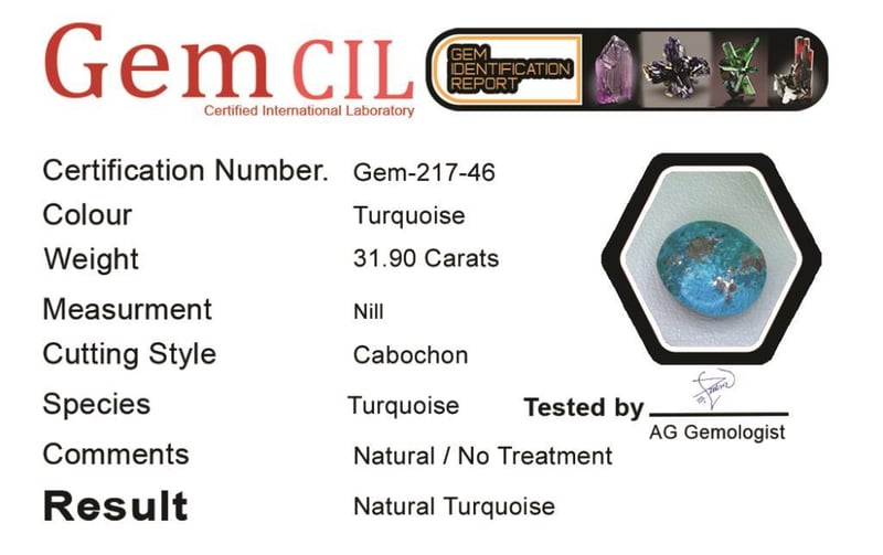 31.90 CARATS NATURAL QUALITY TURQUOISE 31.90 Carats Natural Quality Turquoise Stone = Natural TurquoiseWeight = 31.90 Carats Cut = Cabochon Colour = TurquoiseQuantity = 1Note = Gem Cil, Certified, Condition: Good - Refer Images 0488269+46