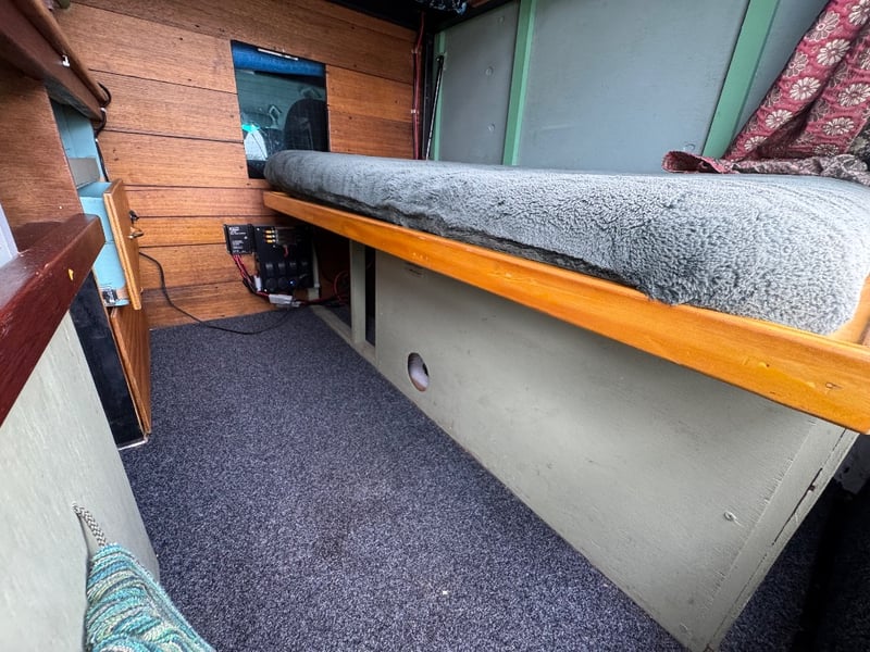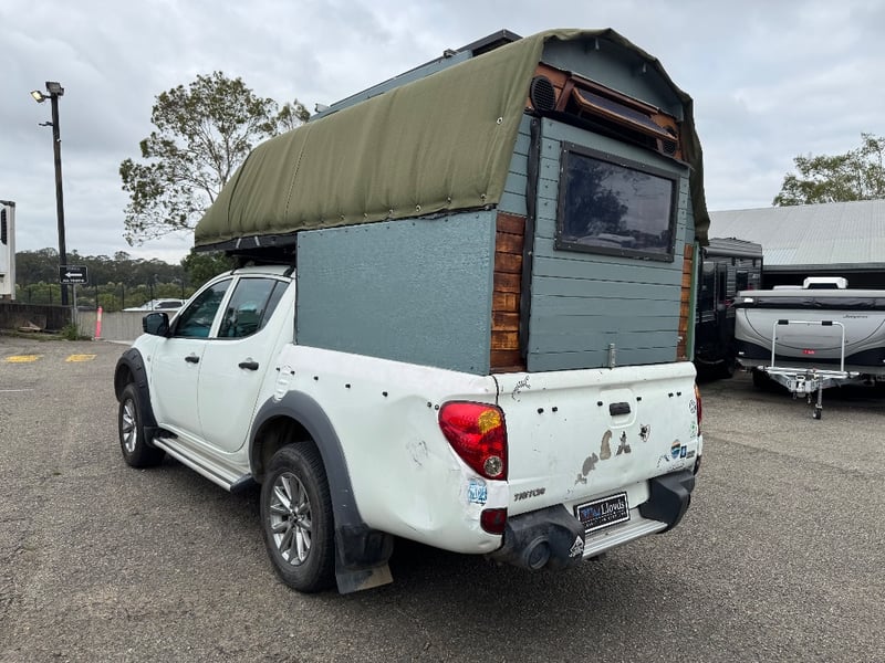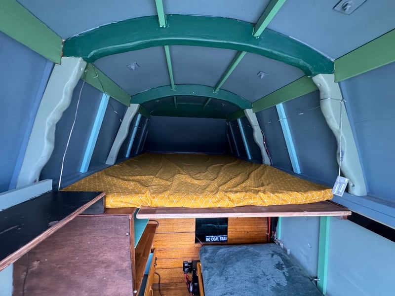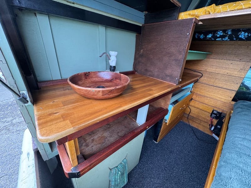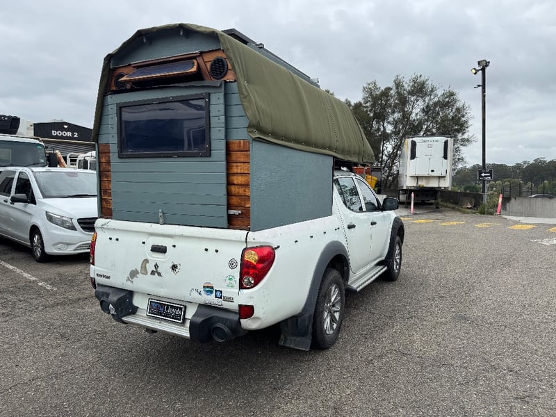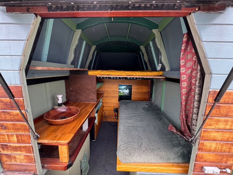 Current RWC, cosy cabin fit out, lockable, timber built, insulated, attached via steel frame, removable, waterproof, 12v fridge, 15L water bottle, , elevated double bed, kitchenette with sink and tap, storage, seating area, auxiliary battery, solar power, fairy lighting