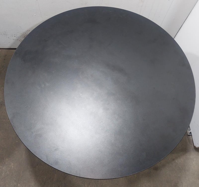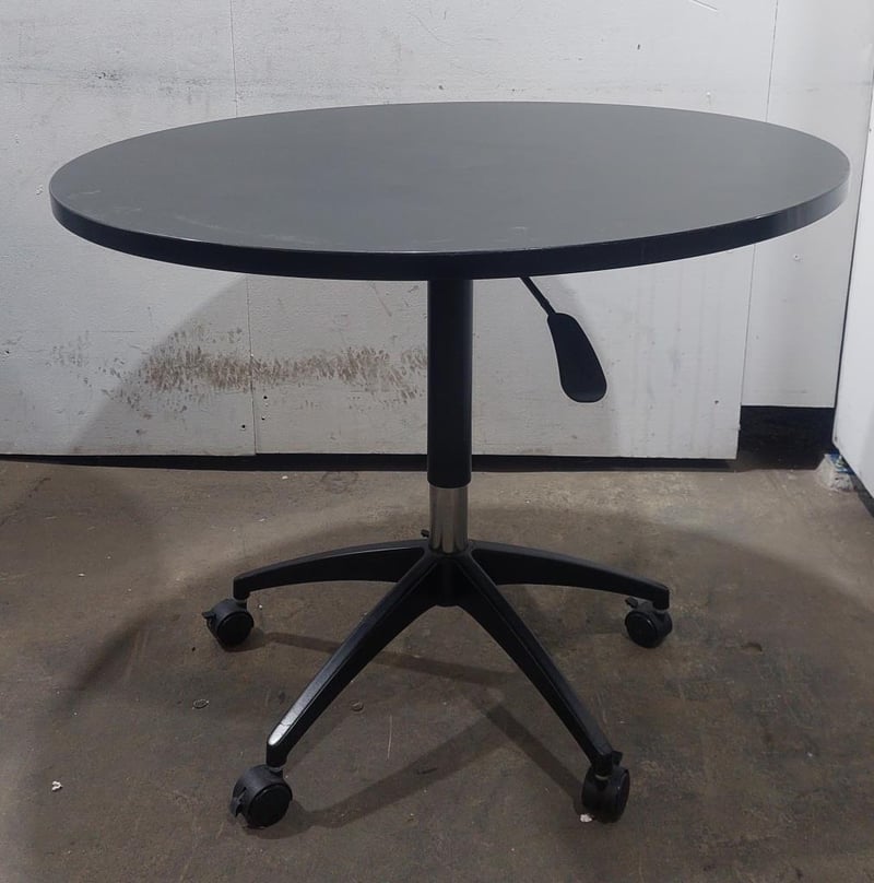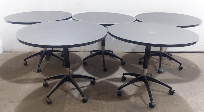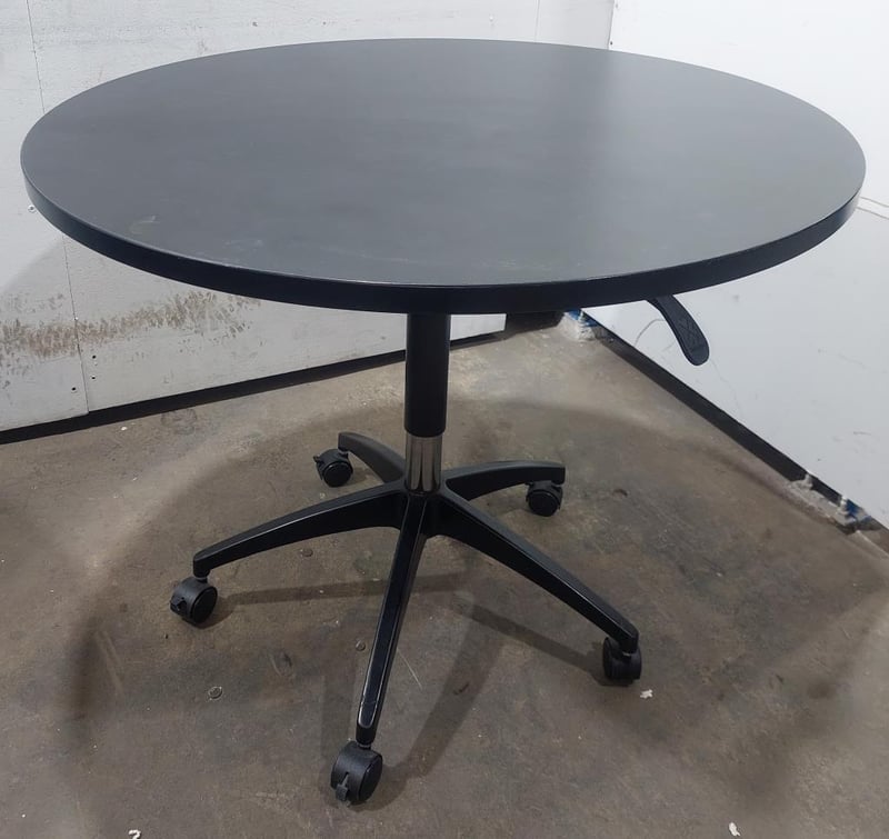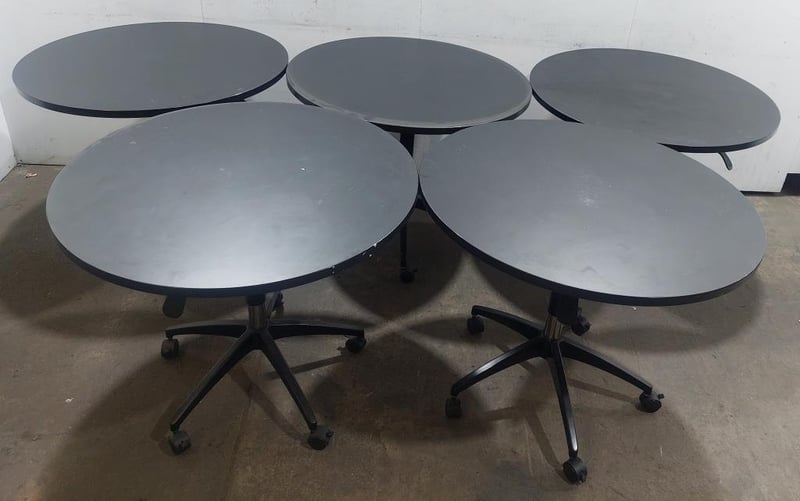 Height-adjustable black mobile round table. Qty: 5 per lot. Dims: 90cm, L, 90cm W, height: adjustable. Sold as a lot. Note: signs of wear.