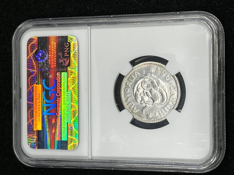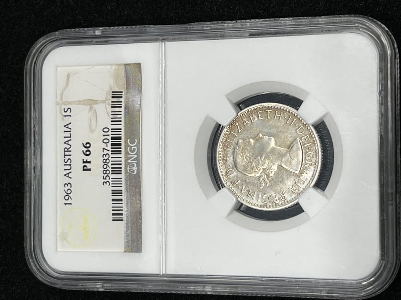 AUSTRALIAN 1963 NGC GRADED PF66 SILVER SHILLING COIN. (page 66 Renniks 32nd edition value $200) Condition: Proof 587616+29