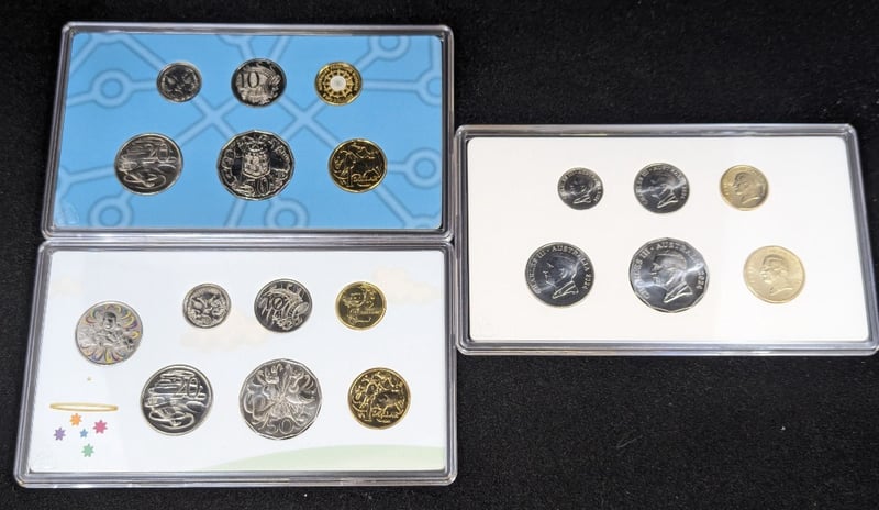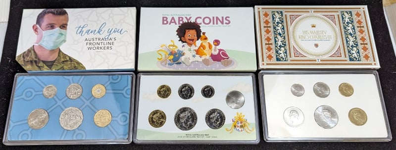 THREE AUSTRALIAN UNCIRCULATED YEAR SETSIncludes 2022 Australian Frontline Workers Six Coin Year Set, 2022 Baby Coins Uncirculated Year Set, 2024 King Charles Ill Six Coin Year SetCondition: Unc584893+45