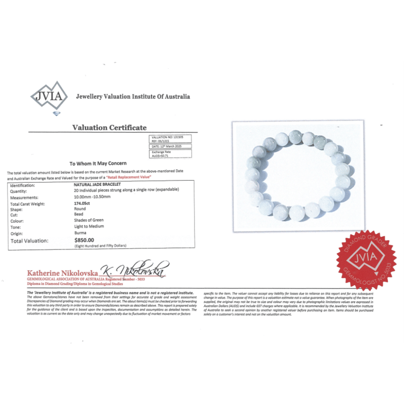 BURMESE JADE BEAD BRACELET, 20 ROUND, LIGHT TO MEDIUM SHADES OF GREEN, (174.05CT TSW, 10.00MM-10.50MM BEADS), BURMESE ORIGIN, INDIVIDUALLY STRUNG, EXPANDABLE. Valuations Provided by an Independent Third-Party Professional Not Directly Associated With Lloyds Auctions at AUD $850This valuation has been conducted by an independent third-party professional. The valuation amount is an assessment by the issuing valuer and does not reflect the auction value of the item. Any inquiries regarding the valuation should be directed to the issuing valuer (refer to contact details on the certificate), as Lloyds Auctions has no affiliation or influence over the valuation, the valuer, or the stated amount. Condition: Good - Refer Images 0645864+1340