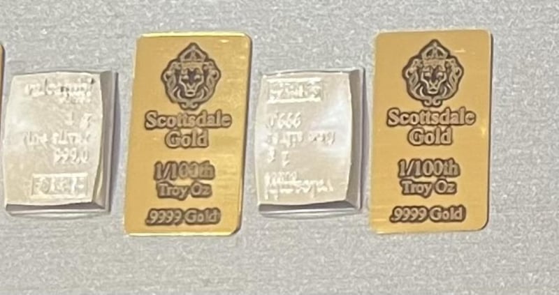 1/100 SCOTTDALE GOLD BAR X 2, 1 GRAM VALCUMBI SILVER BAR X 2 311115+25