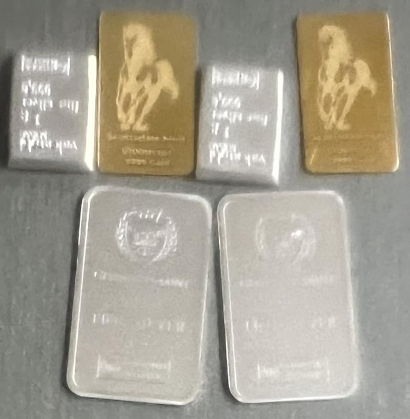 1/100 SCOTTDALE GOLD BAR X 2, 1 GRAM VALCUMBI SILVER BAR X 2 & 1 GRAM GERMANIA MINT SILVER BAR X 2
