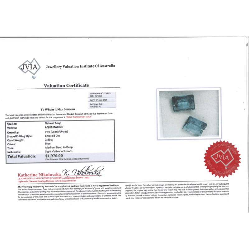 2.81CT TSW X 2, NATURAL BERYL AQUAMARINES, EMERALD CUT, MEDIUM DEEP-DEEP BLUE, EYE VISIBLE INCLUSIONS, LOOSE, UNSET. Valuations Provided by an Independent Third-Party Professional Not Directly Associated With Lloyds Auctions at AUD $1970This valuation has been conducted by an independent third-party professional. The valuation amount is an assessment by the issuing valuer and does not reflect the auction value of the item. Any inquiries regarding the valuation should be directed to the issuing valuer (refer to contact details on the certificate), as Lloyds Auctions has no affiliation or influence over the valuation, the valuer, or the stated amount. Condition: Good - Refer Images 0+2004