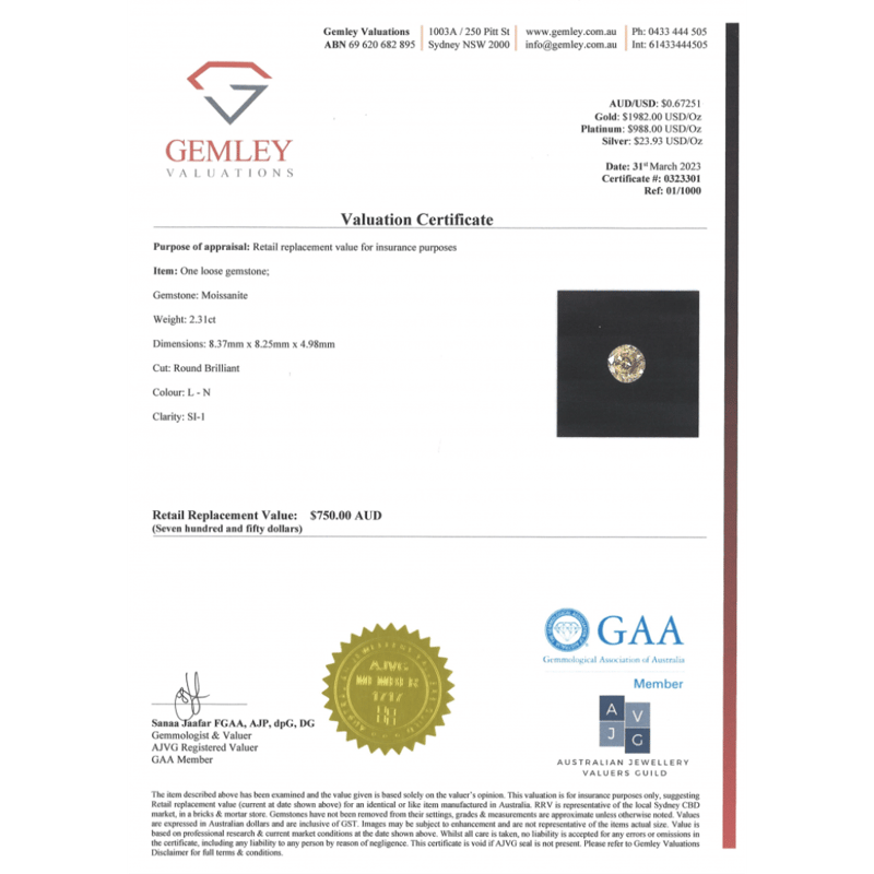 2.31CT NATURAL MOISSANITE, ROUND BRILLIANT CUT, L-N COLOUR, SI1 CLARITY, LOOSE, UNSET. Valuations Provided by an Independent Third-Party Professional Not Directly Associated With Lloyds Auctions at AUD $750This valuation has been conducted by an independent third-party professional. The valuation amount is an assessment by the issuing valuer and does not reflect the auction value of the item. Any inquiries regarding the valuation should be directed to the issuing valuer (refer to contact details on the certificate), as Lloyds Auctions has no affiliation or influence over the valuation, the valuer, or the stated amount. Condition: Good - Refer Images 0+2075