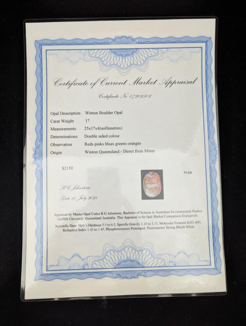 17 CARATS WINTON BOULDER OPAL. REDS PINKS BLUES GREENS ORANGES. 25X17X4 Valuations Provided by an Independent Third-Party Professional Not Directly Associated With Lloyds Auctions at AUD $2150This valuation has been conducted by an independent third-party professional. The valuation amount is an assessment by the issuing valuer and does not reflect the auction value of the item. Any inquiries regarding the valuation should be directed to the issuing valuer (refer to contact details on the certificate), as Lloyds Auctions has no affiliation or influence over the valuation, the valuer, or the stated amount. 586030+3