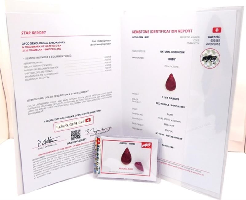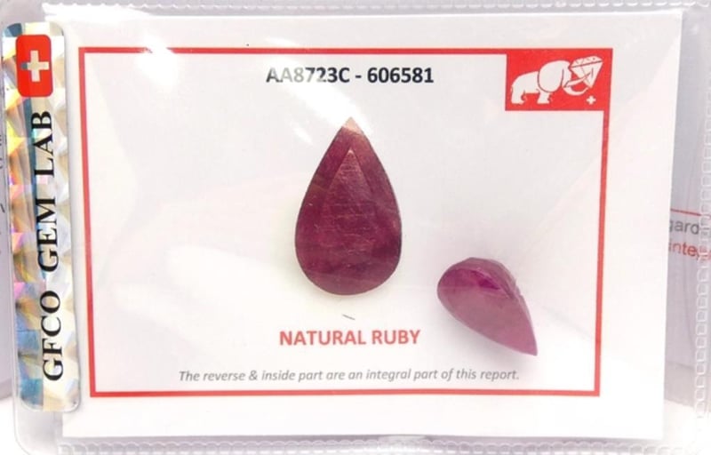 11.51CT RUBY Pear Cut, Purple Red Tajikistan Ruby, Loose, Unset, (Stone Was Not Heat Treated). Comes In Sealed Packet With Gfco Report #Aa8723C Jewellery Valuations Provided By A Third Party Professional Not Directly Associated With Lloyds Auctions at AUD $60000 This Insurance Valuation has been provided by a registered Jewellery Valuer and is intended for insurance purposes only. The valuation amount has no bearing on the auction value of the item. Any questions regarding the valuation should be directed to the issuing Valuer (refer to contact details on the certificate) as Lloyds have no association or relationship with the Valuer or the valuation amount contained within the valuation. 0 584860+3