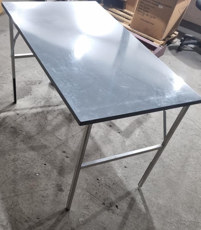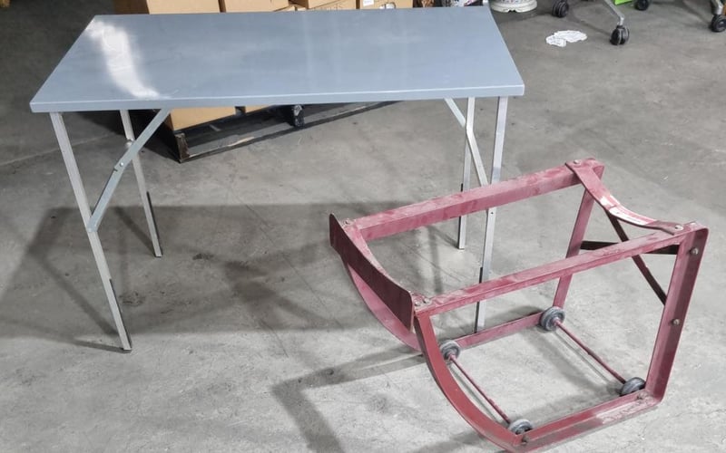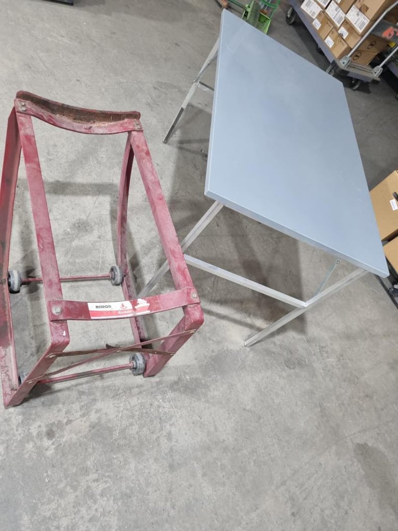 Metal Foldable table, plus maroon trolley with wheels...... Sold as lot