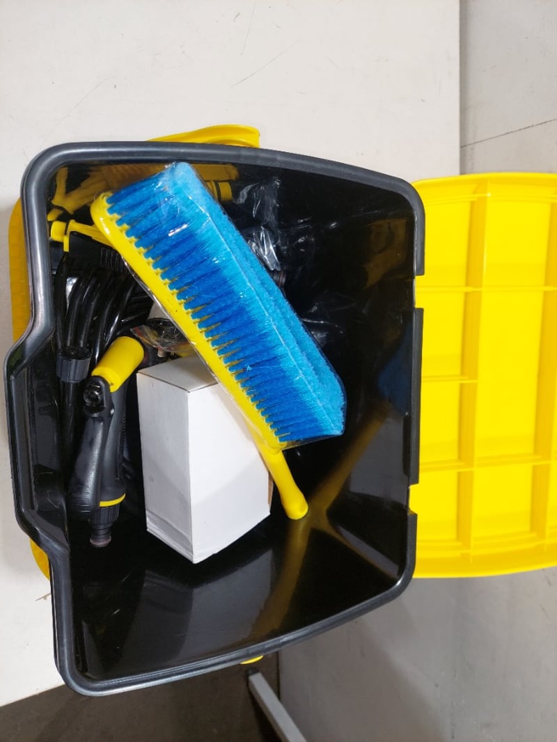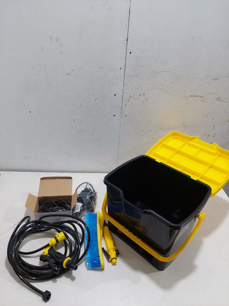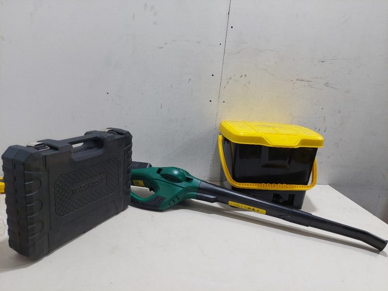 Portable pressure washer, cordless air compressor and leaf blower.Sold as a lot.Note: items are untested.