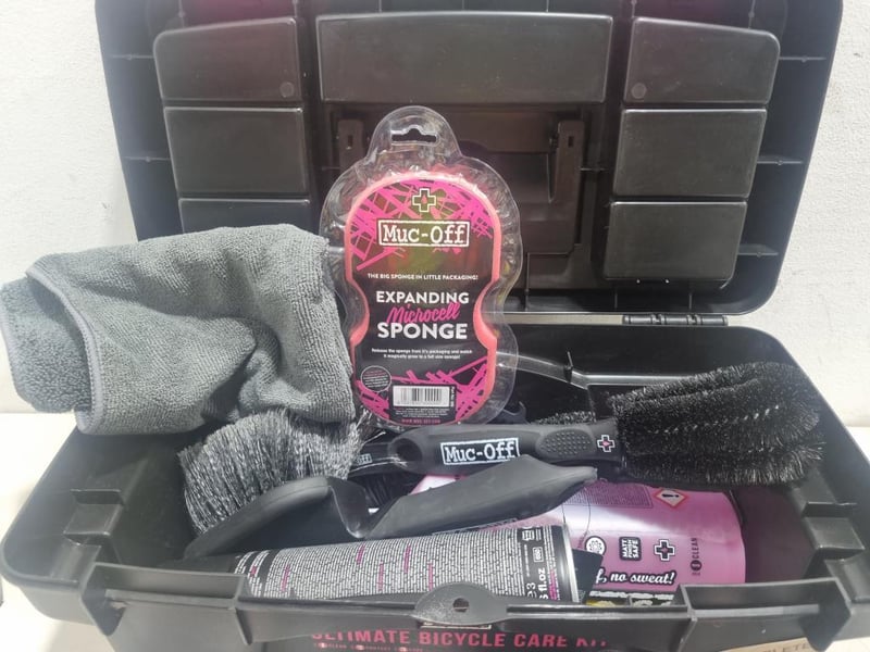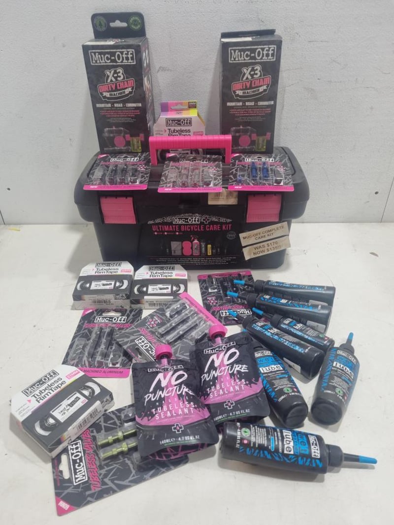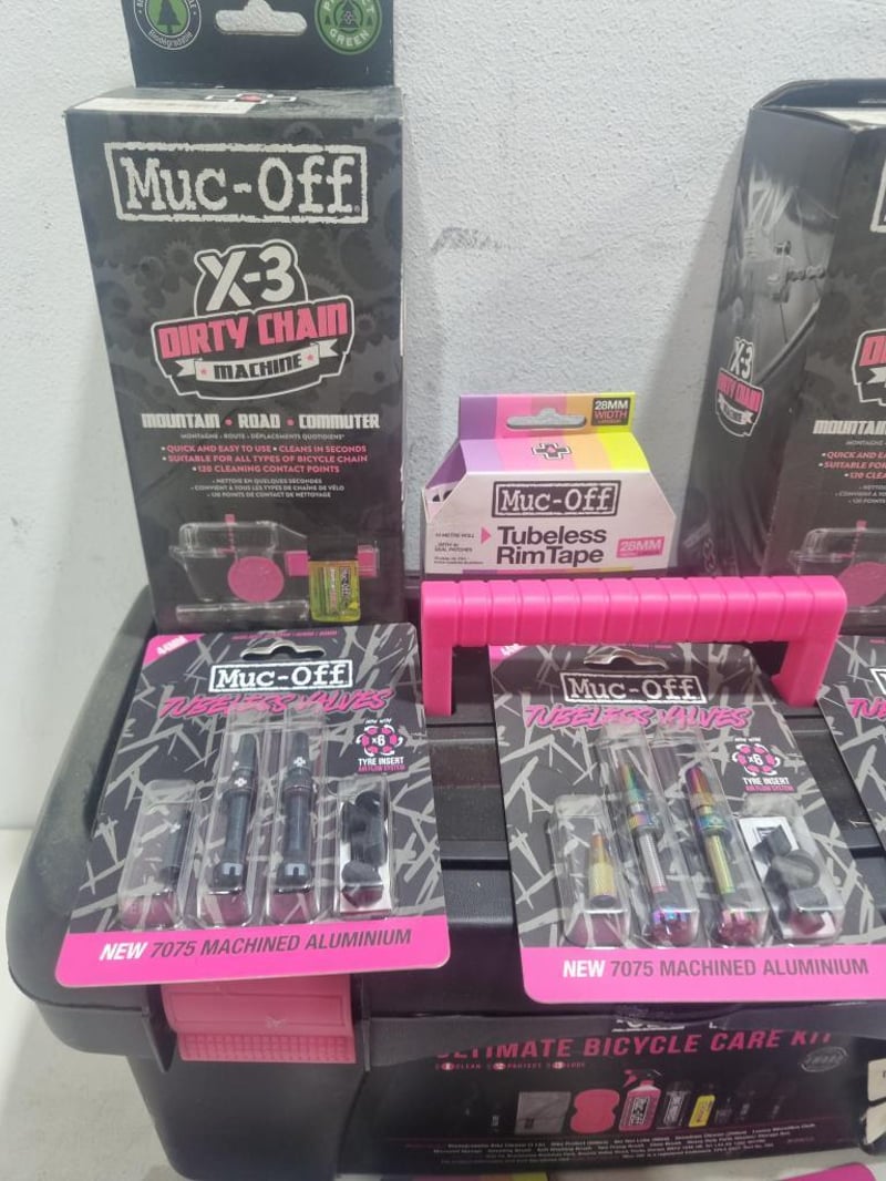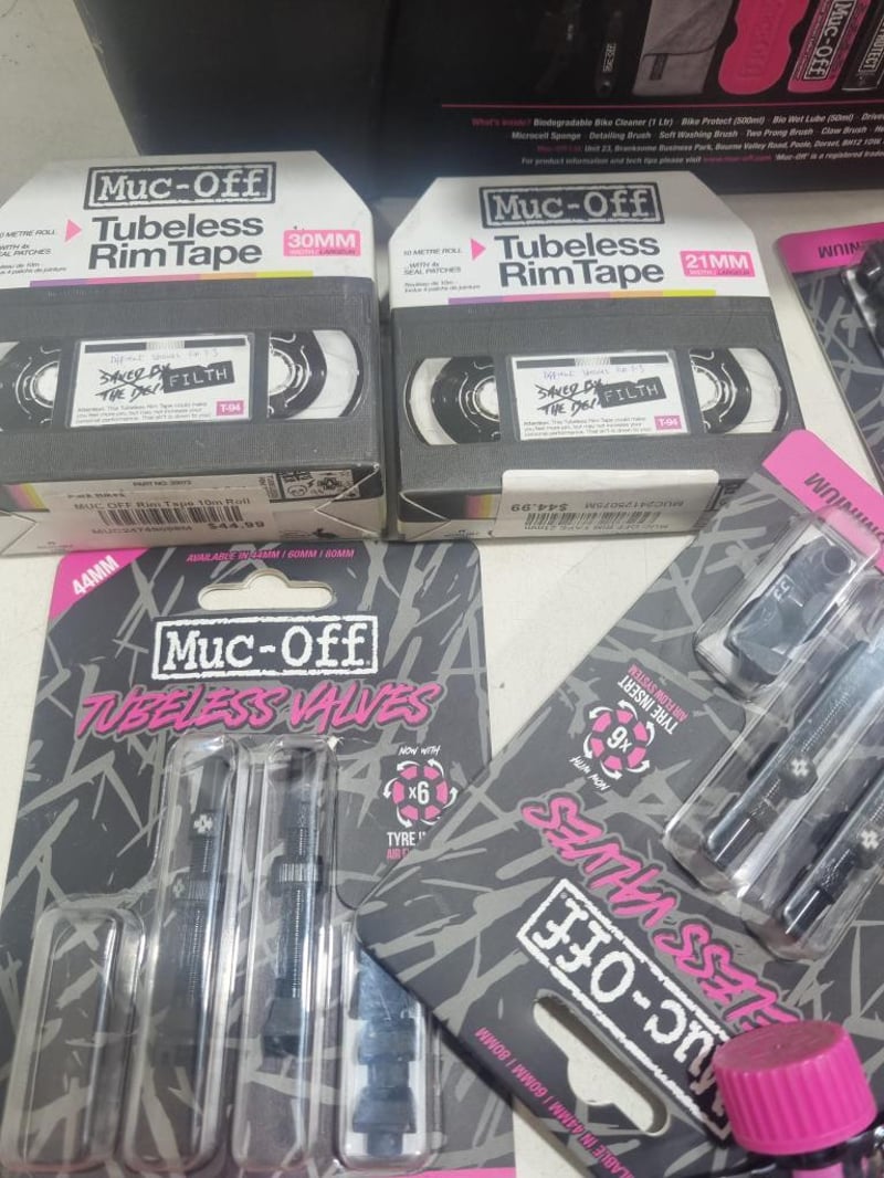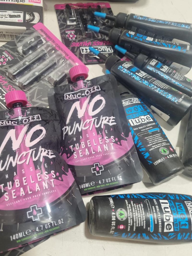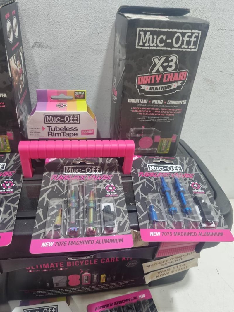 Assorted MUC-OFF brand items. Includes drive chain cleaner, tubeless valves, wet weather lube and more....... Sold as lot