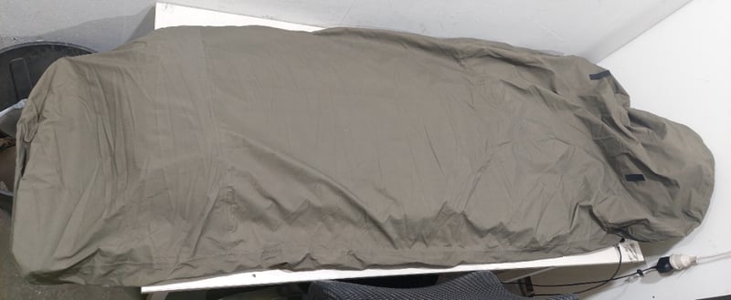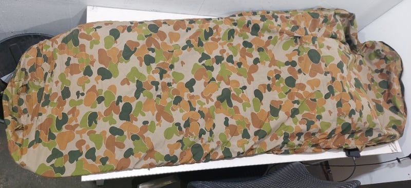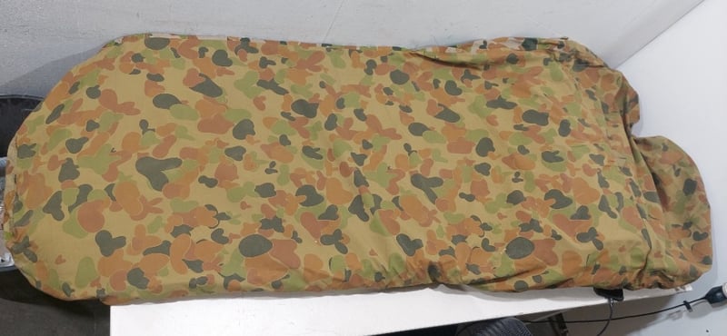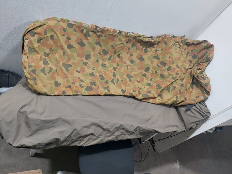 Jumbo sleeping bag in an Auscam (Australian camouflage) pattern, alomg with a bivy bag. Sold as a lot.