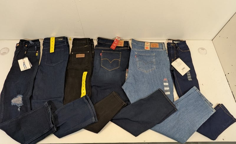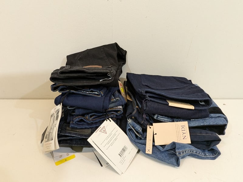 Box of 10 Brand New Jeans Including Unisex Calvin Klein,Levis,Wrangler, Guess and Women's Bettina Liano Jeans Sizes Include: 6,9,24,8