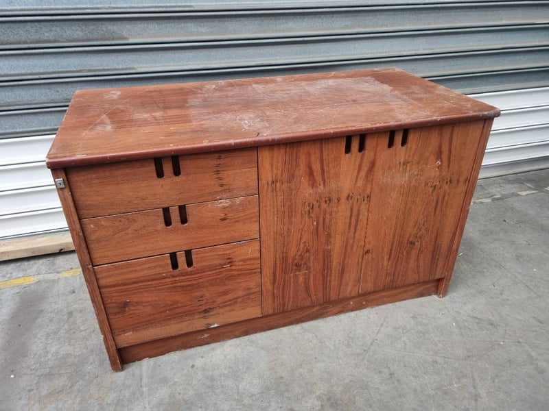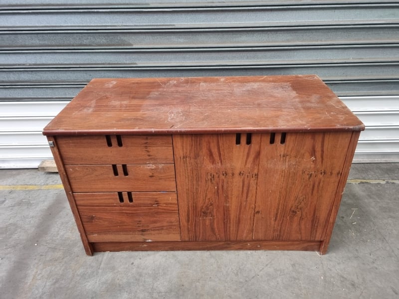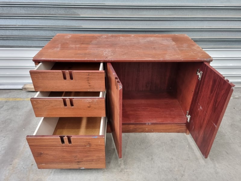 Cabinet, wood type, brown, 3 drawers, Dimensions approx: 119 w x 59 d x 72 h The proceeds from this item sale go to the Little Red Heart Charity to help fund mental health support for children in need. Get ready to bid with heart and make a difference!