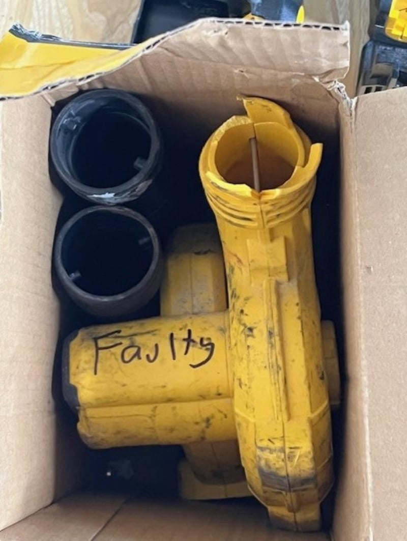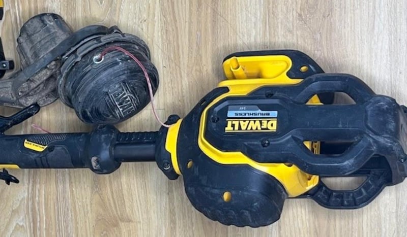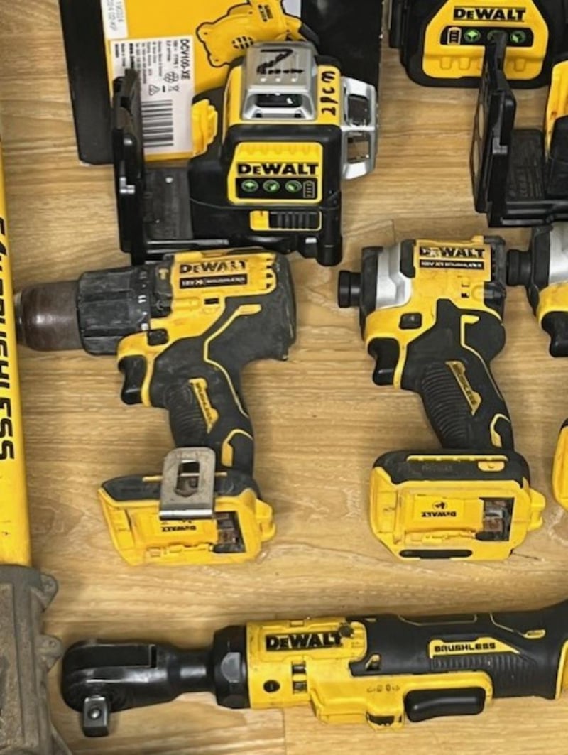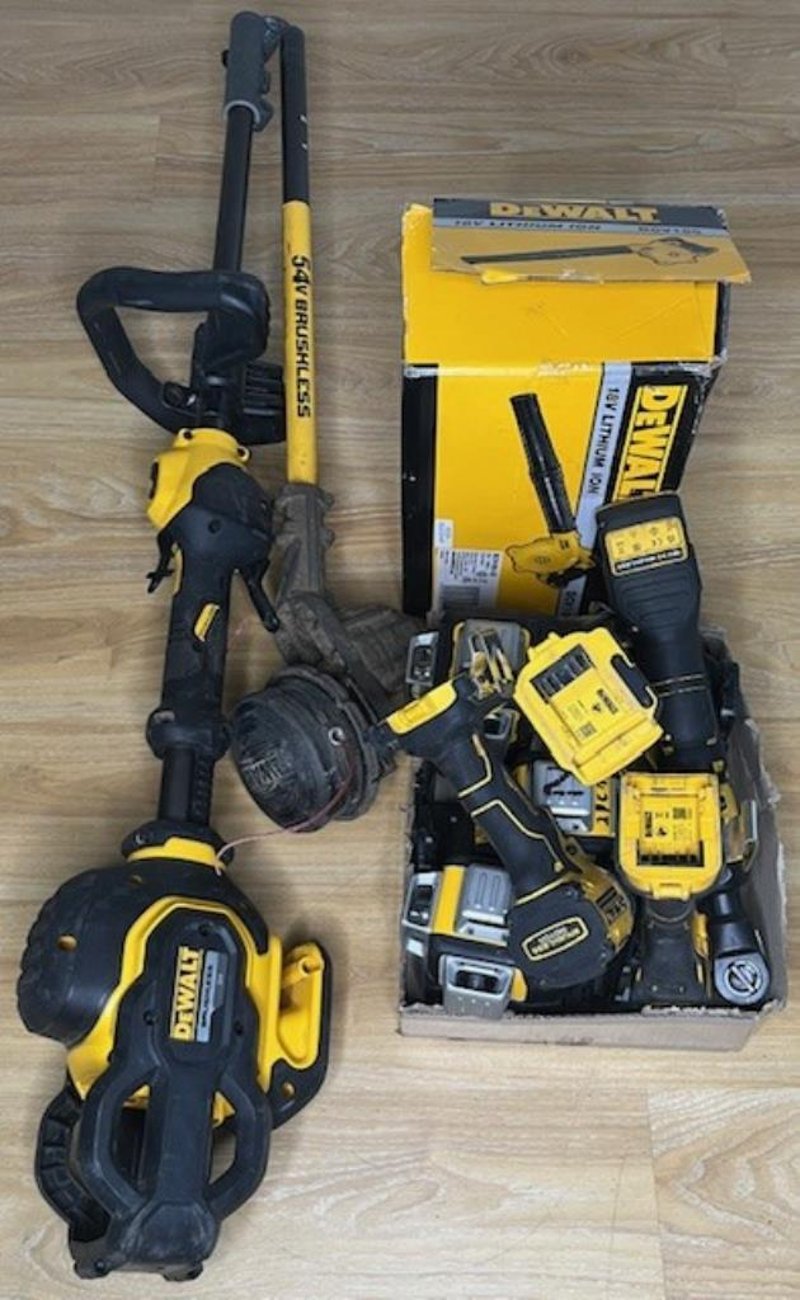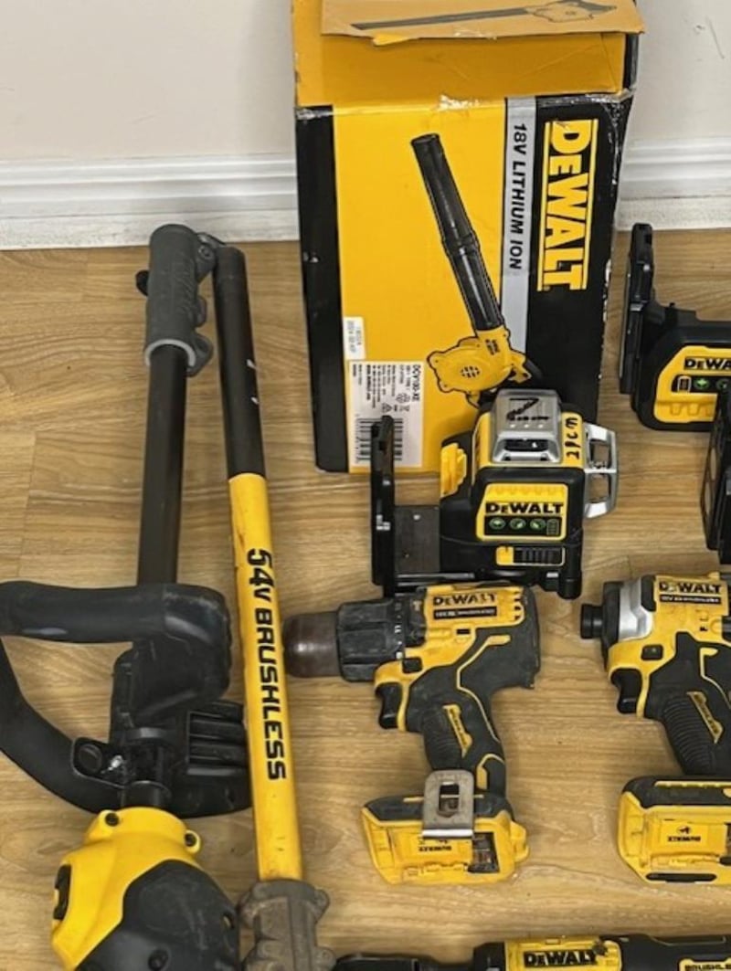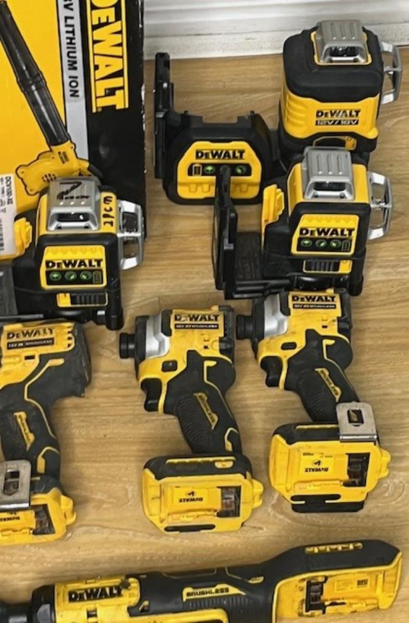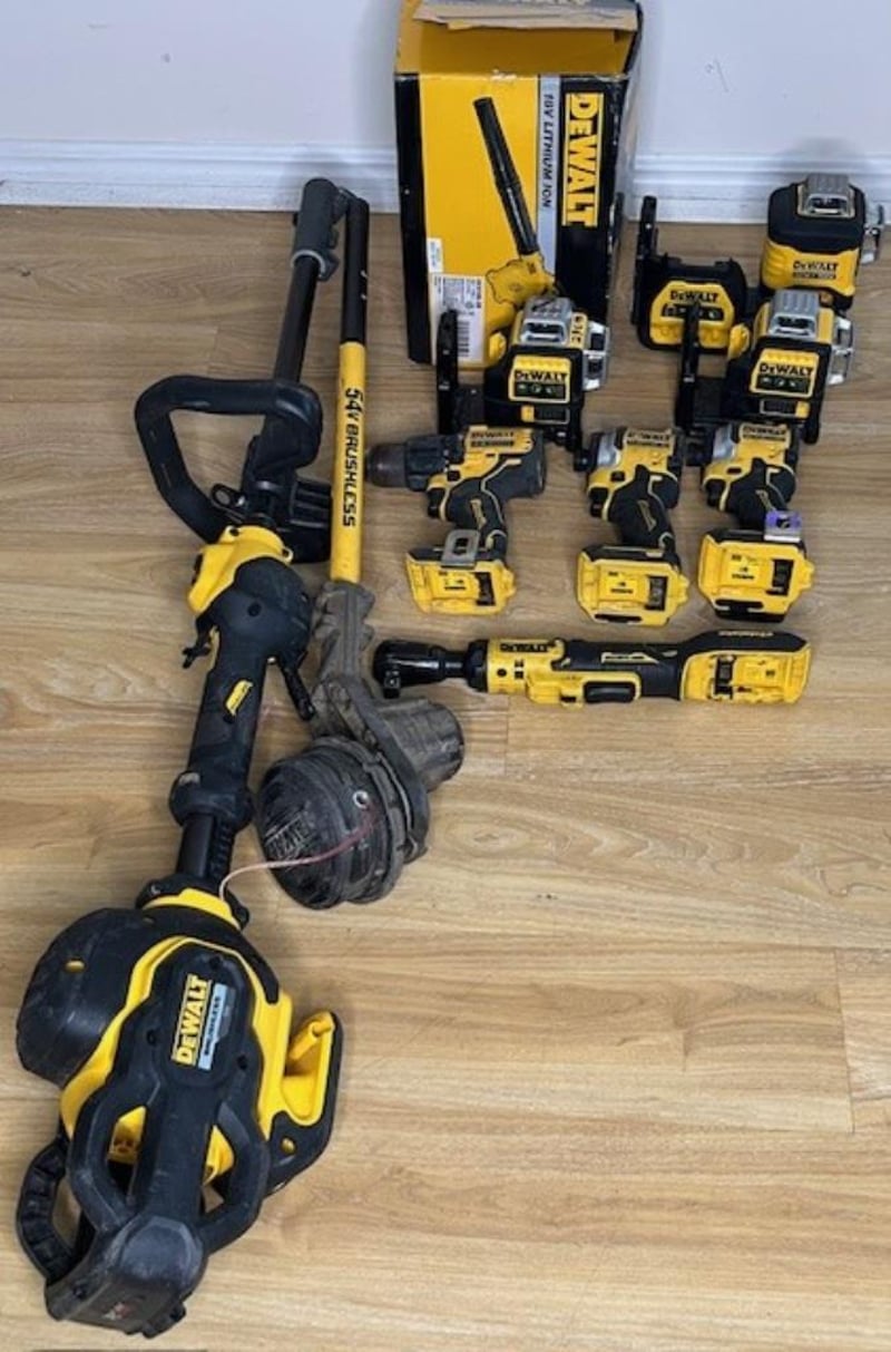 Cordless DeWalt 18V tools. 1 x DCV100-XE mini blower, 2 x DCF850 impact drivers, 1 x DCM5713-XE line trimmer, 1 x DCD709 hammer drill, 1 x DCF512 TY impact wrench, 2 x DCE089G laser levels, 1 x unknown laser level. Skins only, no batteries. Condition: Not working, untested, for parts or repair.