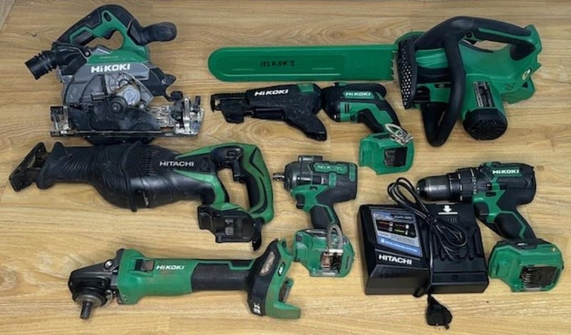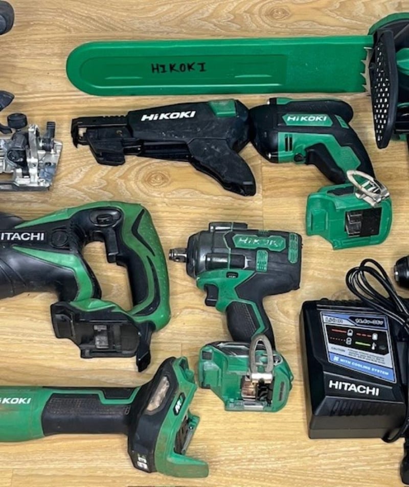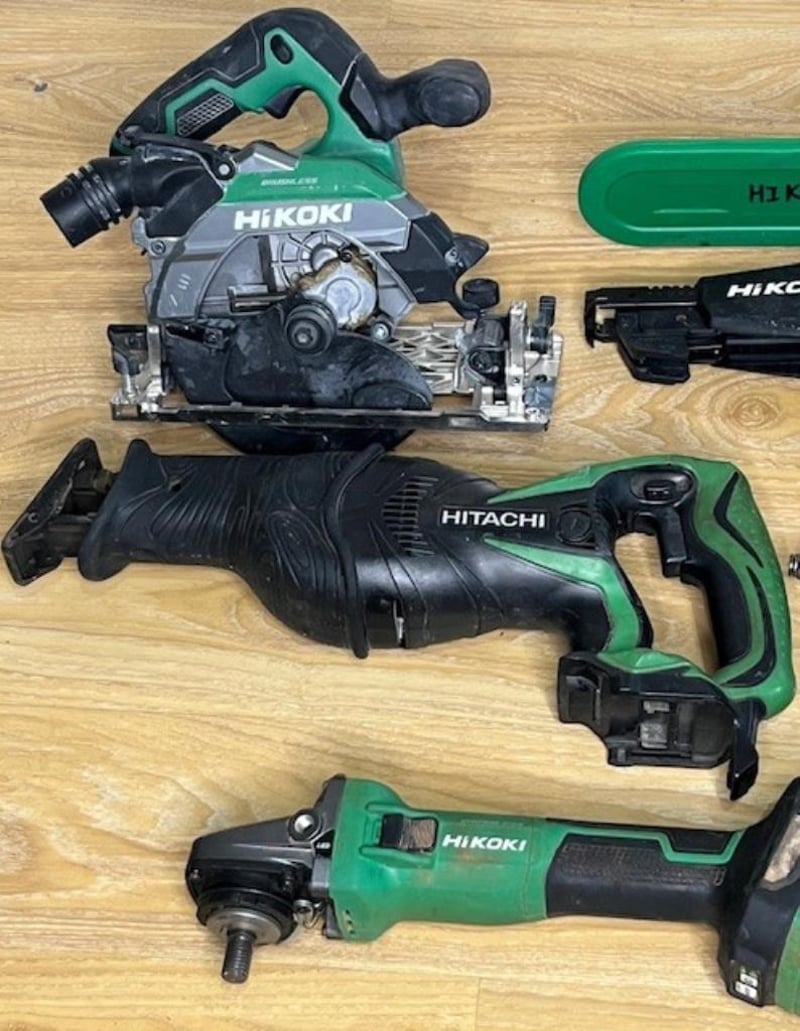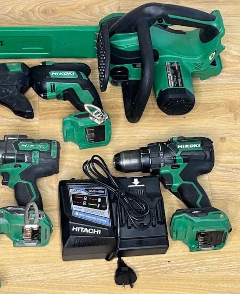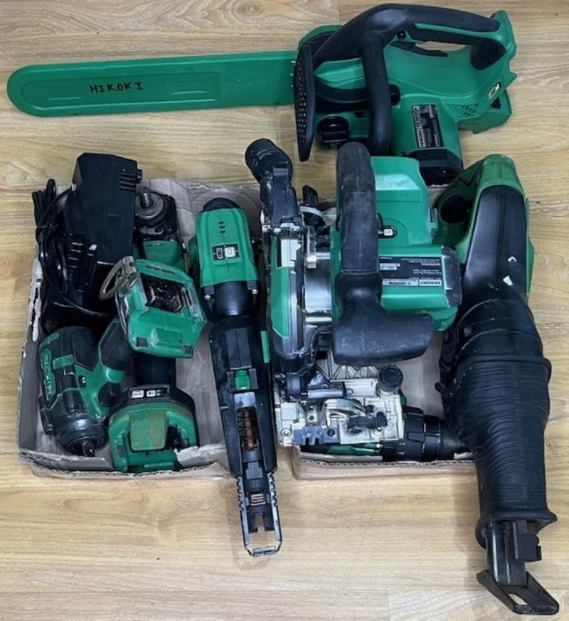 Cordless Hikoki Hitachi tools. 1 x DV 36DC hammer drill 36V, 1 x WR 18DH impact wrench 18V, 1 x G 3613DVE angle grinder 36V, 1 x CR 18DSL reciprocating saw 18V, 1 x C 1806DB circular saw 18V, 1 x CS 3630DA chainsaw 36V, 1 x W 18DA plaster screwdriver 18V, 1 x UC 36YRSL charger. Skins only, no batteries. Condition: Not working, untested, for parts or repair.