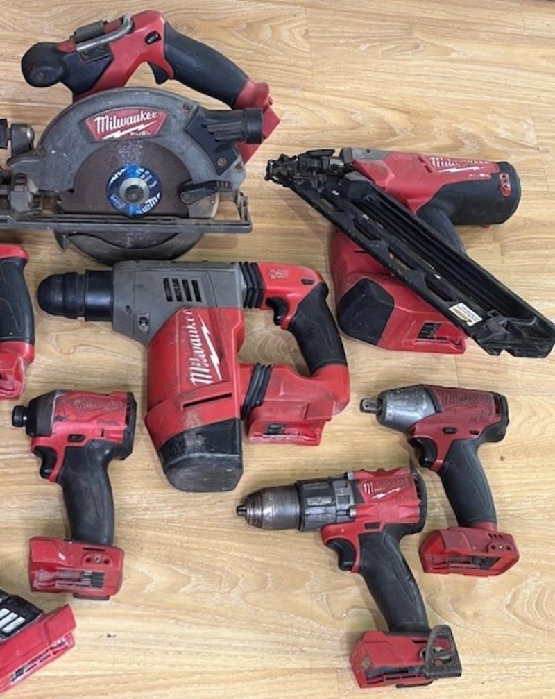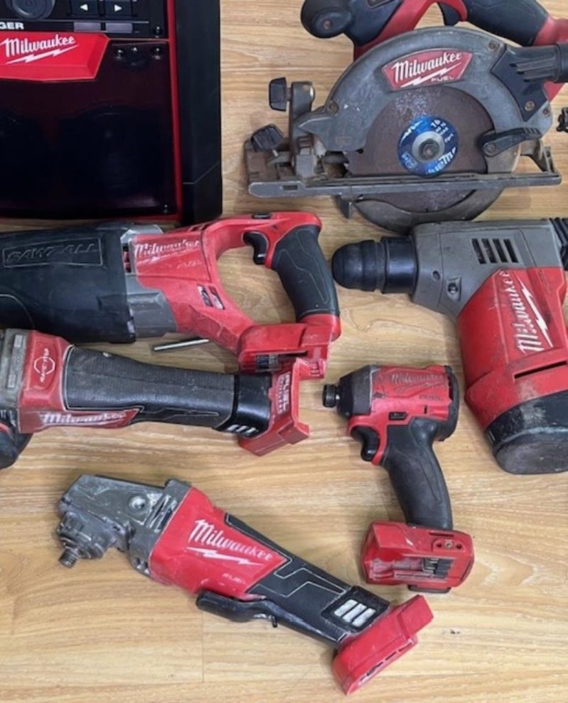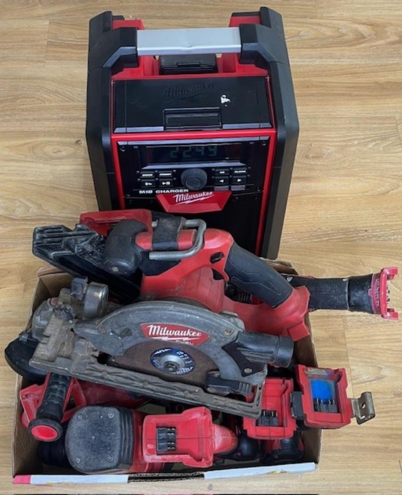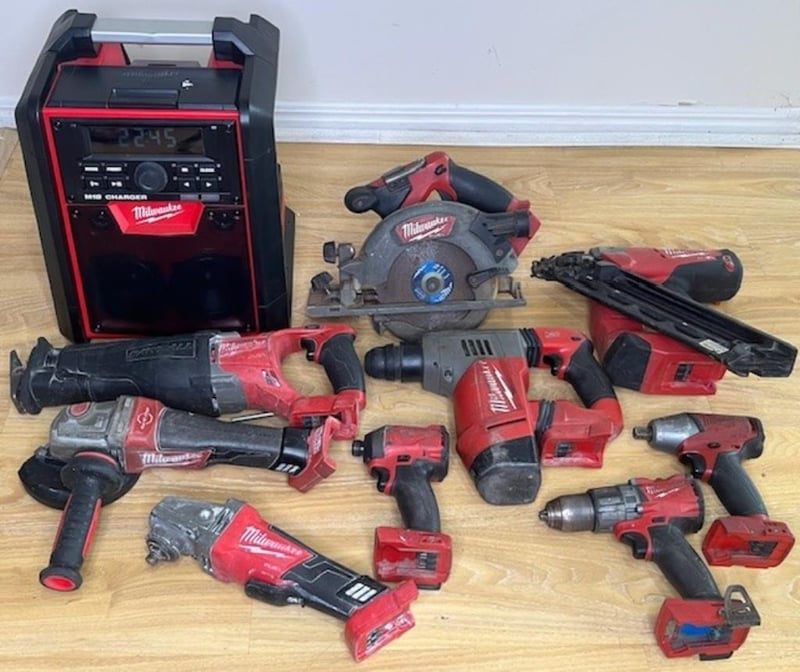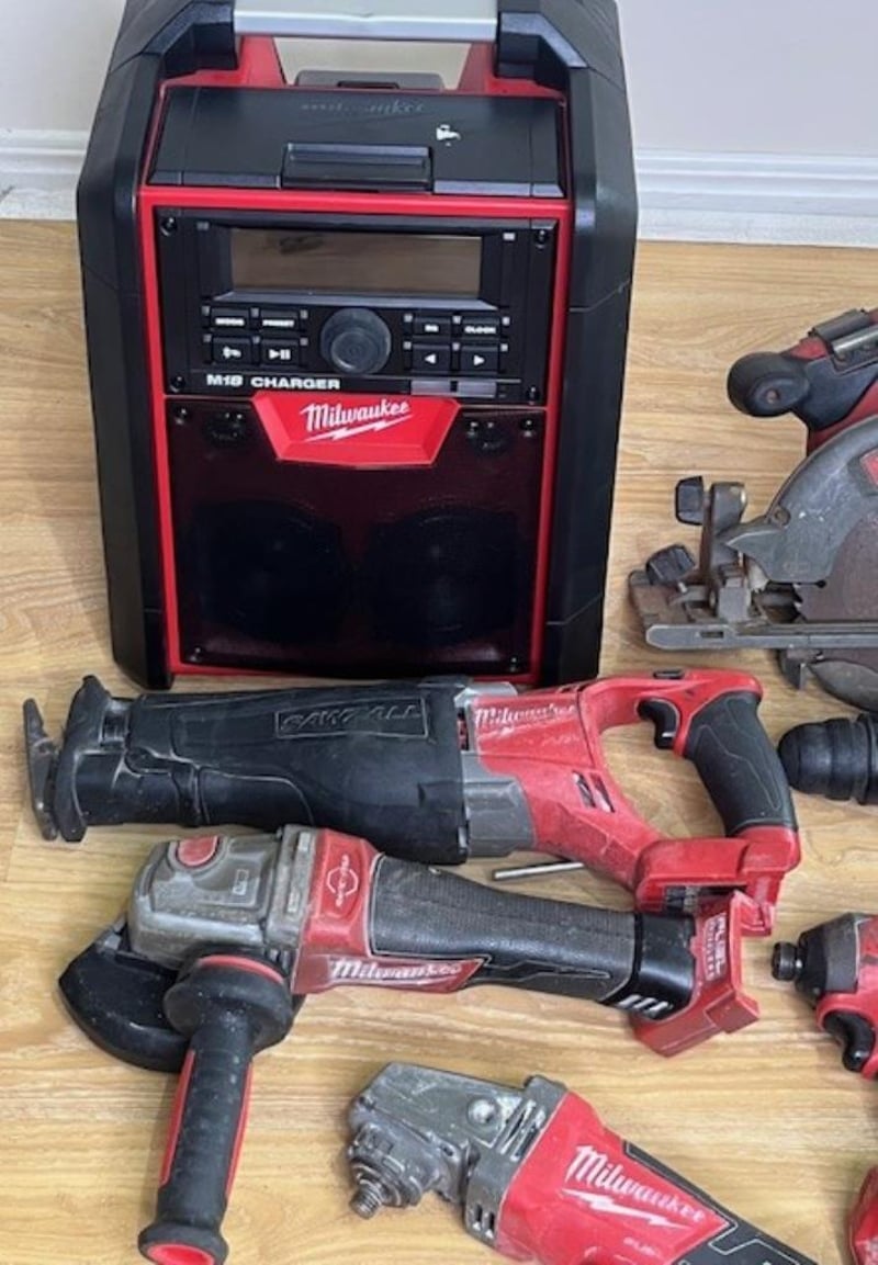 Cordless Milwaukee 18V tools. 1 x M18 CCS55 circular saw, 1 x M18 CSX reciprocating saw, 1 x M18 CHP rotary hammer drill, 1 x M18 hammer drill, 1 x M18 FIWP12 impact wrench, 2 x M18 angle grinders, 1 x M18 impact driver, 1 x M18 15CNGA nailer, 1 x M18 RC bluetooth radio. Skins only, no batteries. Condition: Not working, untested, for parts or repair.