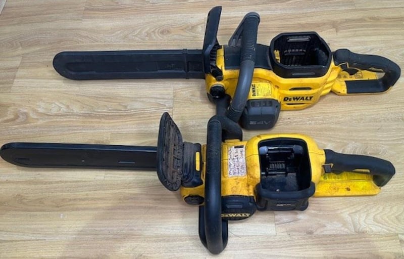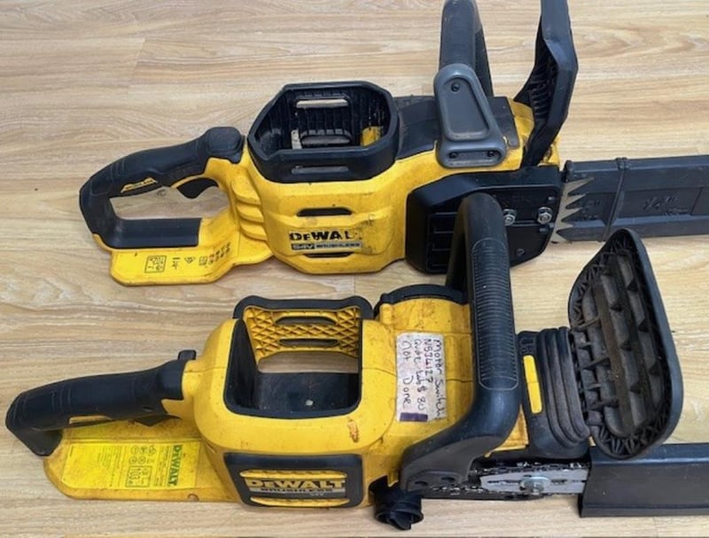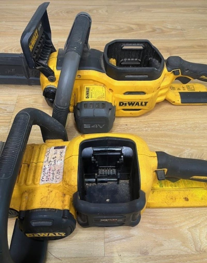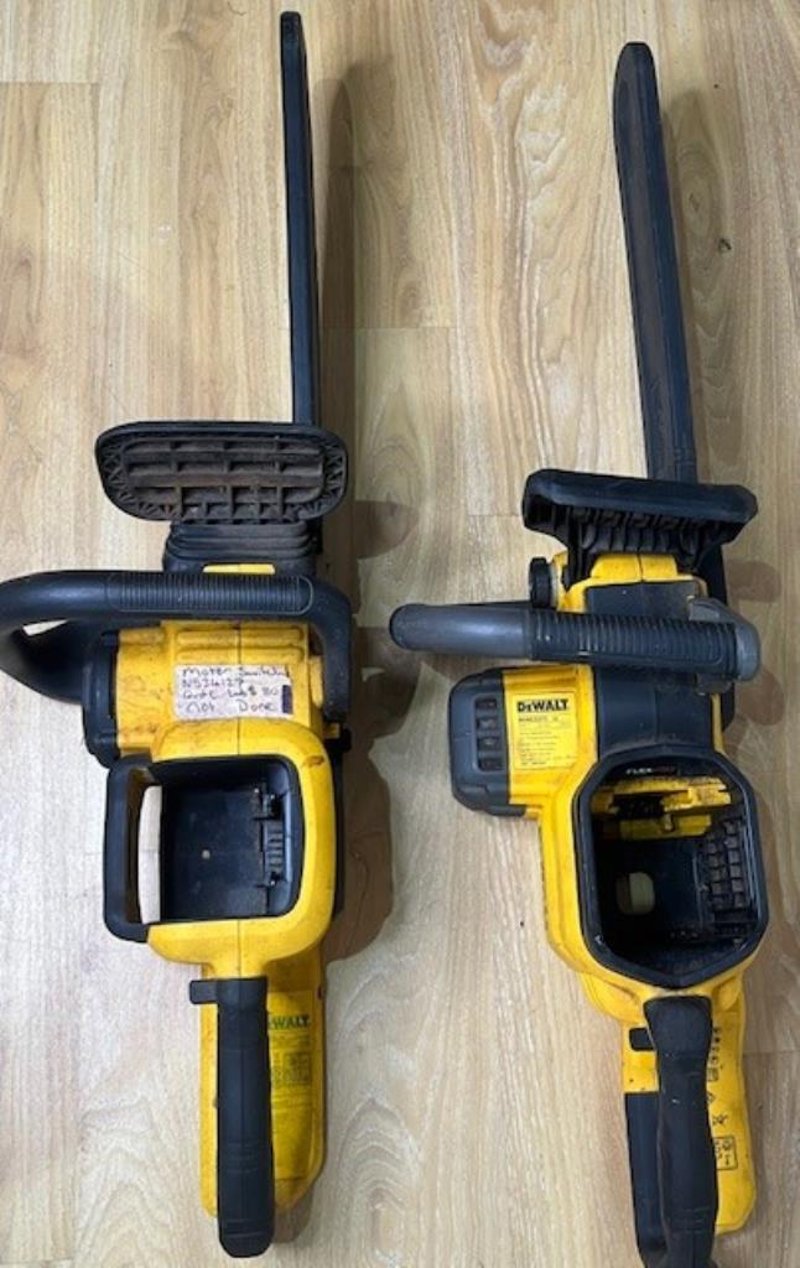 Cordless DeWalt 54V chainsaws. 1 x DCMCS573-XE, 1 x DCM575-XE. Skins only, no batteries. Condition: Not working, untested, for parts or repair.