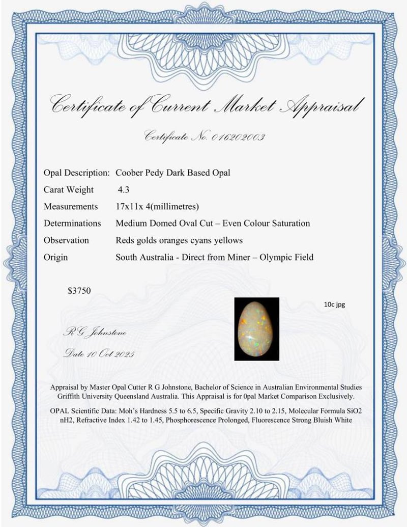 4.3 CARATS COOBER PEDY DARK BASED OPAL FROM THE OLYMPIC FIELD. MEDIUM DOMED OVAL CUT WITH BRIGHT AND EVEN COLOUR SATURATION . REDS GOLDS ORANGES CYANS YELLOWS. 17X11X4 Valuations Provided by an Independent Third-Party Professional Not Directly Associated With Lloyds Auctions at AUD $3750This valuation has been conducted by an independent third-party professional. The valuation amount is an assessment by the issuing valuer and does not reflect the auction value of the item. Any inquiries regarding the valuation should be directed to the issuing valuer (refer to contact details on the certificate), as Lloyds Auctions has no affiliation or influence over the valuation, the valuer, or the stated amount. Condition: Good - Refer Images 0586190+10