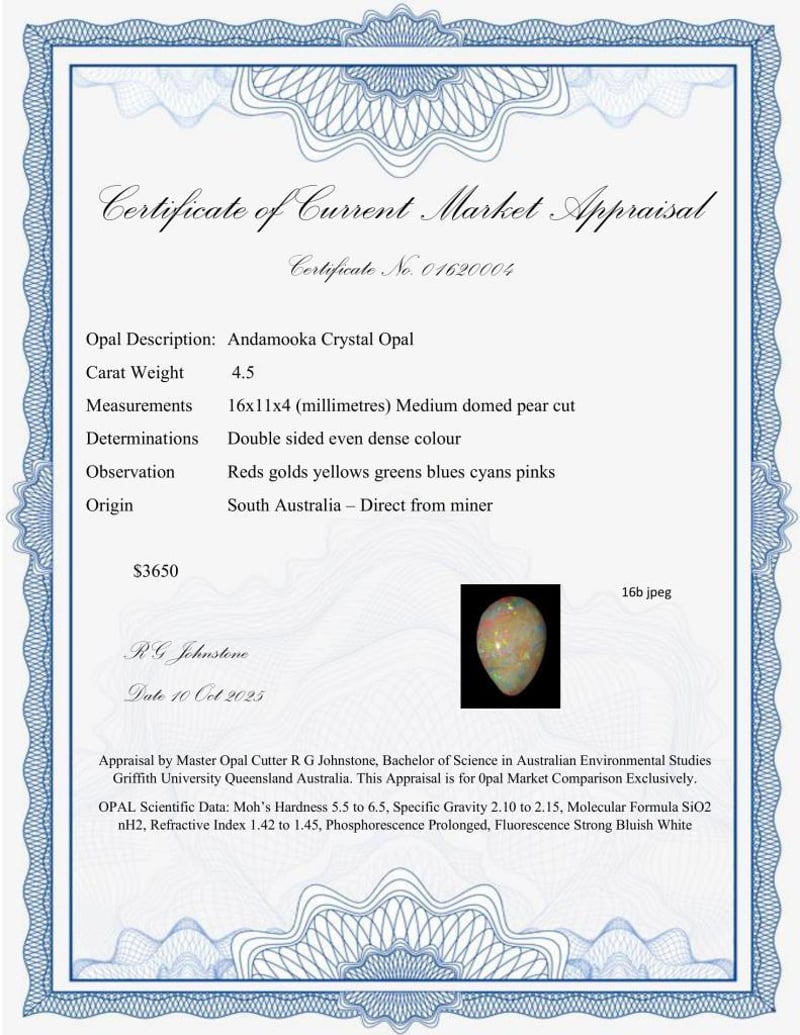 4.5 CARATS ANDAMOOKA CRYSTAL OPAL. MEDIUM DOMED PEAR CUT WITH GOOD FIRE AND COLOUR SATURATION. 16X11X4 Valuations Provided by an Independent Third-Party Professional Not Directly Associated With Lloyds Auctions at AUD $3650This valuation has been conducted by an independent third-party professional. The valuation amount is an assessment by the issuing valuer and does not reflect the auction value of the item. Any inquiries regarding the valuation should be directed to the issuing valuer (refer to contact details on the certificate), as Lloyds Auctions has no affiliation or influence over the valuation, the valuer, or the stated amount. Condition: Good - Refer Images 0586190+16