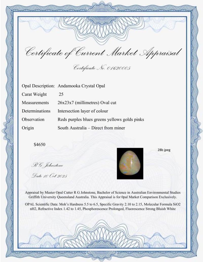 25 CARATS ANDAMOOKA WHITE OPAL. VERY UNUSUAL STONE WITH MULTI DEPTH LAYERS OF IRIDESCENT COLOUR PLAY. REDS PURPLES BLUES GREENS YELLOWS GOLDS PINKS. READY TO SET. 26X23X7 Valuations Provided by an Independent Third-Party Professional Not Directly Associated With Lloyds Auctions at AUD $4650This valuation has been conducted by an independent third-party professional. The valuation amount is an assessment by the issuing valuer and does not reflect the auction value of the item. Any inquiries regarding the valuation should be directed to the issuing valuer (refer to contact details on the certificate), as Lloyds Auctions has no affiliation or influence over the valuation, the valuer, or the stated amount. Condition: Good - Refer Images 0586190+28