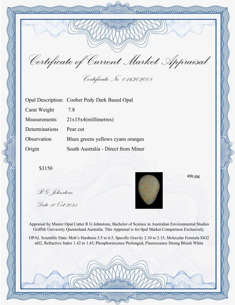 7.8 CARATS COOBER PEDY DARK BASED OPAL. DEEP MULTI LAYERED COLOUR SATURATION, EVEN AND DENSE. PEAR CUT. 21X15X4 Valuations Provided by an Independent Third-Party Professional Not Directly Associated With Lloyds Auctions at AUD $3150This valuation has been conducted by an independent third-party professional. The valuation amount is an assessment by the issuing valuer and does not reflect the auction value of the item. Any inquiries regarding the valuation should be directed to the issuing valuer (refer to contact details on the certificate), as Lloyds Auctions has no affiliation or influence over the valuation, the valuer, or the stated amount. Condition: Good - Refer Images 0586190+49