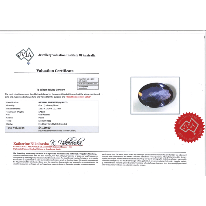 17.83CT NATURAL AMETHYST, OVAL FACETED CUT, MEDIUM DEEP PURPLE, EYE CLEAN/SLIGHTLY INCLUDED, LOOSE, UNSET. Valuations Provided by an Independent Third-Party Professional Not Directly Associated With Lloyds Auctions at AUD $4150This valuation has been conducted by an independent third-party professional. The valuation amount is an assessment by the issuing valuer and does not reflect the auction value of the item. Any inquiries regarding the valuation should be directed to the issuing valuer (refer to contact details on the certificate), as Lloyds Auctions has no affiliation or influence over the valuation, the valuer, or the stated amount. Condition: Good - Refer Images 0645872+2174