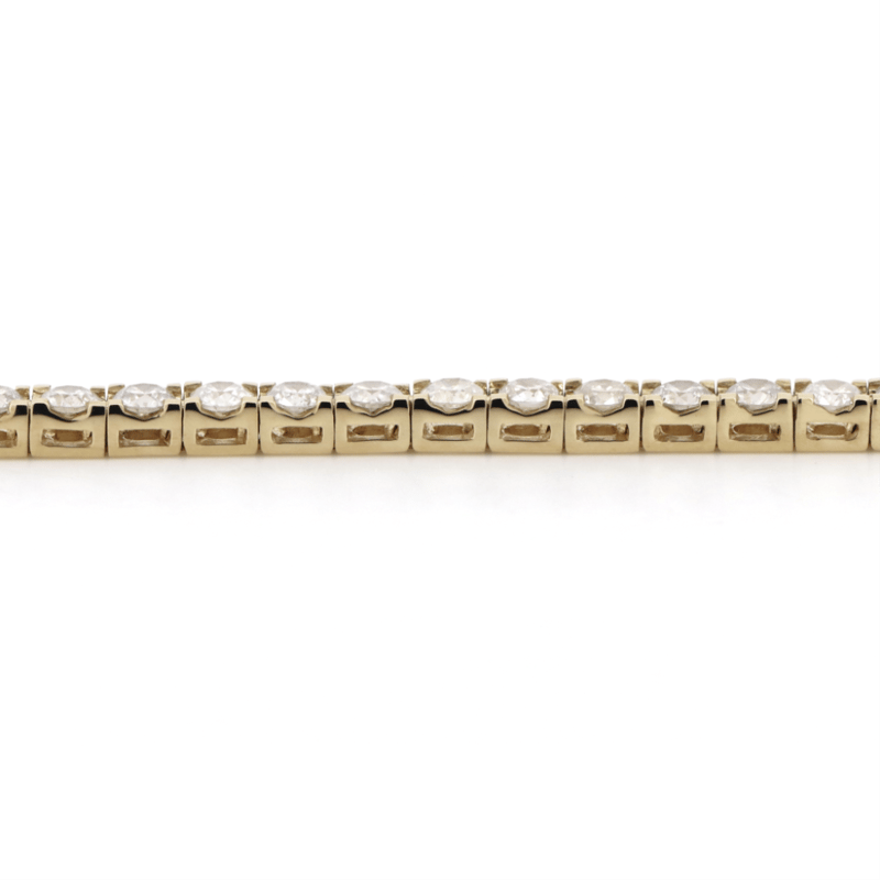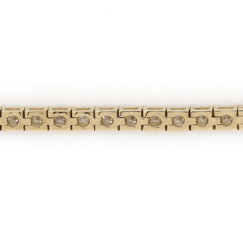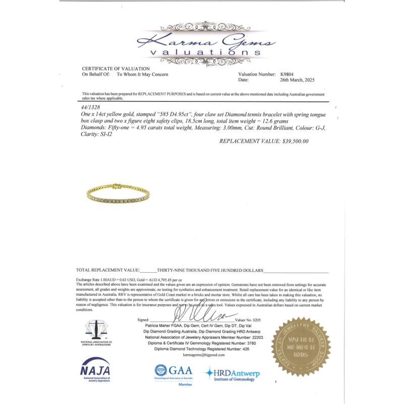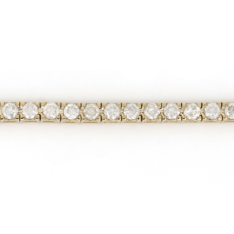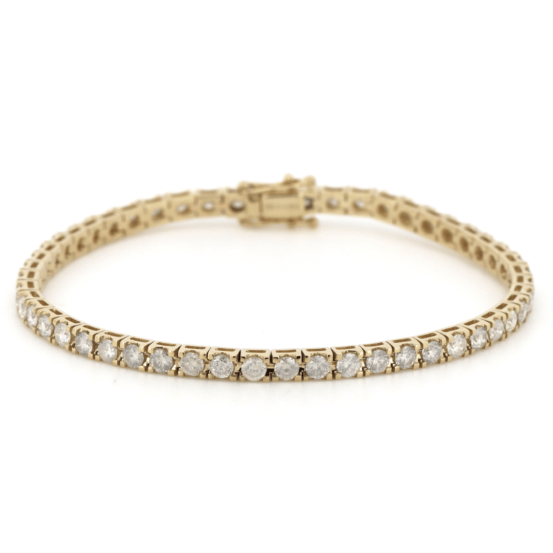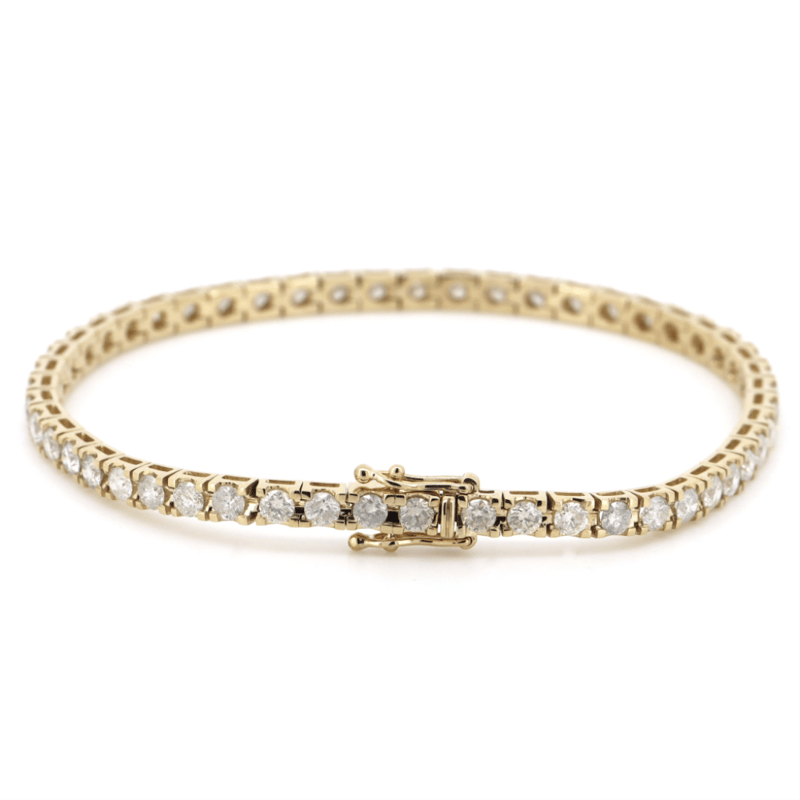 14K YELLOW GOLD, 4.95CT TDW DIAMOND, TENNIS BRACELET. THE DESIGN FEATURES, 51 ROUND BRILLIANT CUT, DIAMONDS (4.95CT TDW, G-J COLOUR, SI-I2 CLARITY), 4 CLAW SET IN A SINGLE ROW. THE BRACELET HAS A BOX LOCK WITH 2 'FIGURE 8' SAFETY CATCHES. BRACELET LENGTH IS 18.5CM.