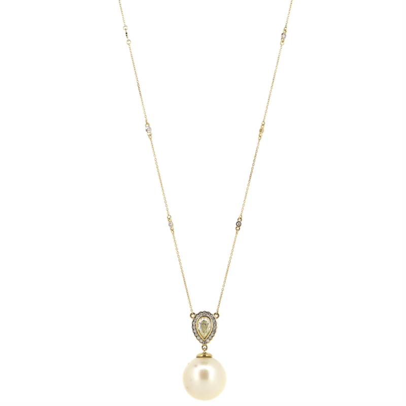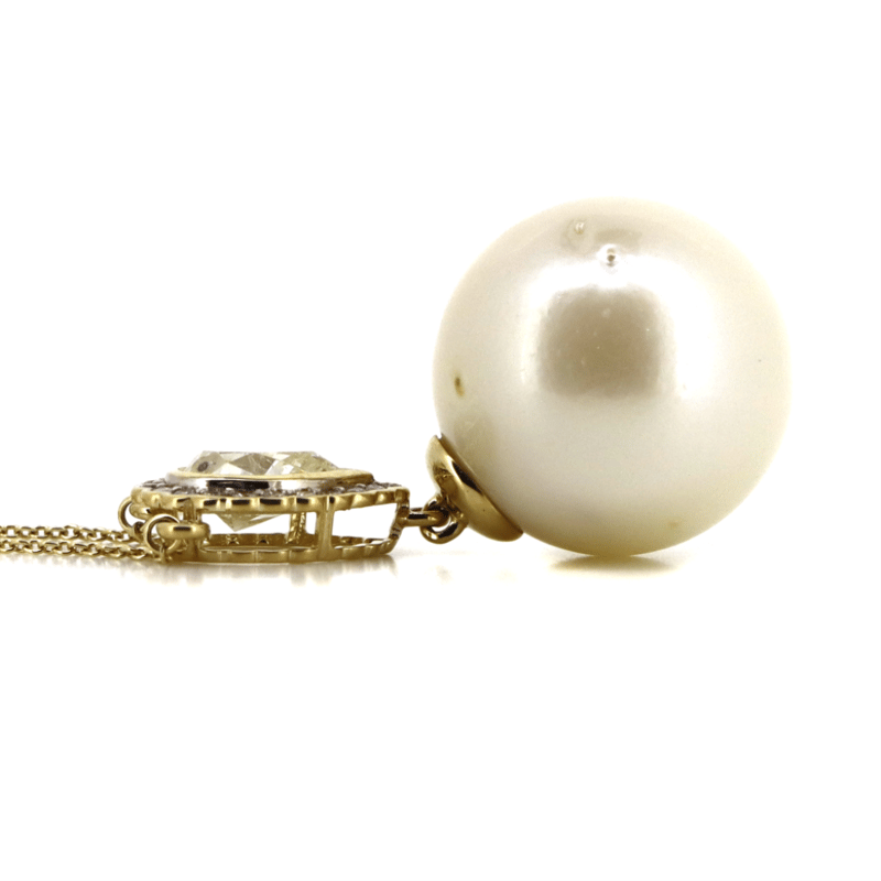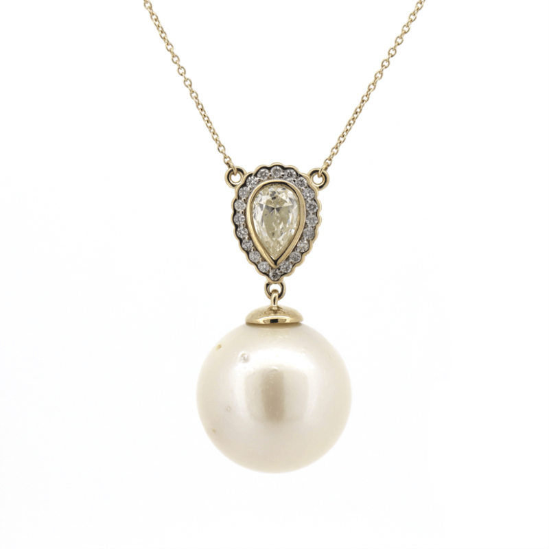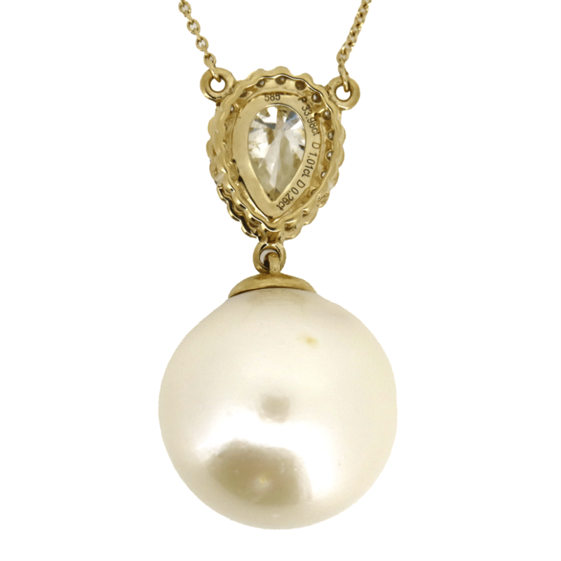 14K YELLOW GOLD, WHITE CULTURED SOUTH SEA PEARL AND DIAMOND, PENDANT NECKLACE. THE NECKLACE FEATURES, ONE ROUND, WHITE CULTURED SOUTH SEA PEARL (33.98CT, AA LUSTRE, VERY FEW BLEMISHES), DROP STYLE. DECORATING THE PENDANT ARE, ONE PEAR BRILLIANT CUT, DIAMOND (1.01CT TDW, K-L COLOUR, SI1-SI2 CLARITY), BEAD SET AND 27 ROUND BRILLIANT CUT, DIAMONDS (0.26CT TDW, G-H COLOUR, SI1 - SI2 CLARITY), BEZEL SET. THE NECKLACE FEATURES A LOBSTER CLAW CLASP AND IS 46CM IN LENGTH. Valuations Provided by an Independent Third-Party Professional Not Directly Associated With Lloyds Auctions at AUD $29000This valuation has been conducted by an independent third-party professional. The valuation amount is an assessment by the issuing valuer and does not reflect the auction value of the item. Any inquiries regarding the valuation should be directed to the issuing valuer (refer to contact details on the certificate), as Lloyds Auctions has no affiliation or influence over the valuation, the valuer, or the stated amount. Condition: Good - Refer Images 0645870+5106