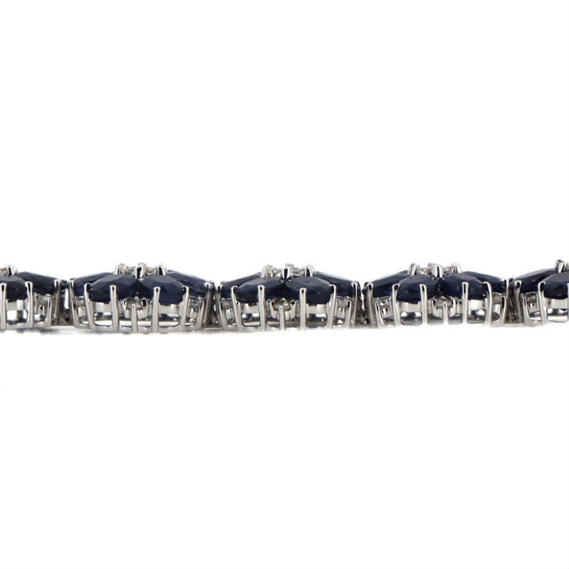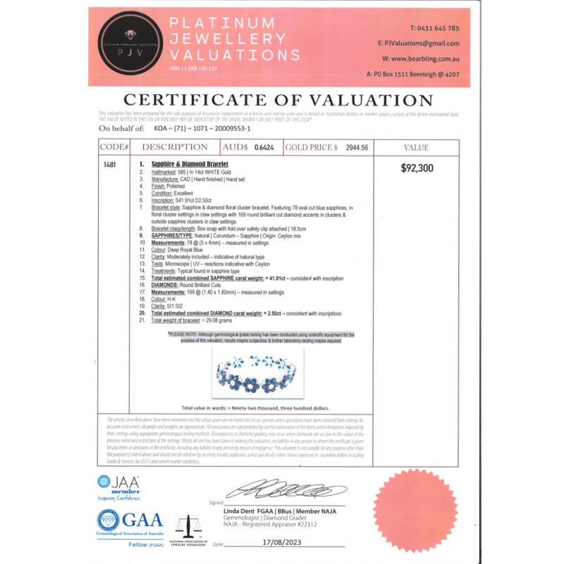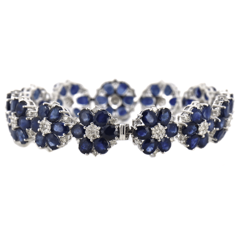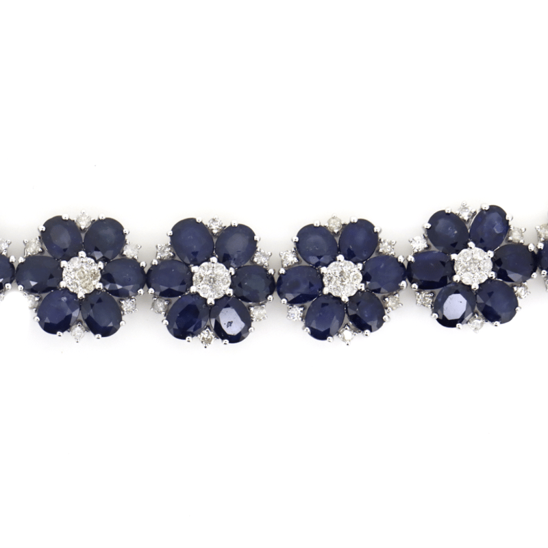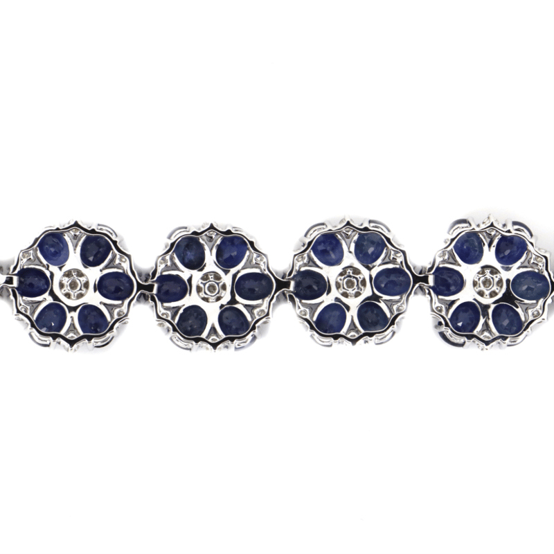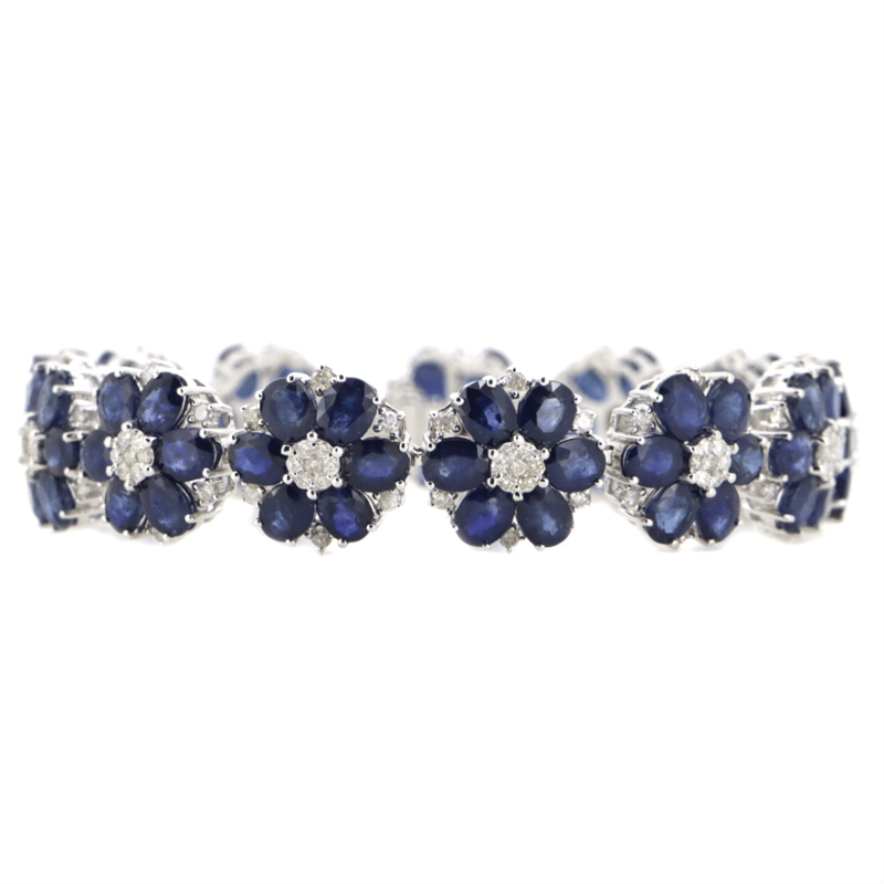14K WHITE GOLD, 41.91CT TSW BLUE CEYLON SAPPHIRE AND DIAMOND, FLORAL BRACELET. THE DESIGN FEATURES, 169 ROUND BRILLIANT CUT, DIAMONDS (2.50CT TDW, H-K COLOUR, SI1-SI2 CLARITY), CLAW SET. SURROUNDING THE CENTRES AS PETALS ARE, 78 OVAL CUT, DEEP ROYAL BLUE, CEYLON SAPPHIRES (41.91CT TSW, MODERATELY INCLUDED), CLAW SET. BRACELET HAS A BOX LOCK WITH SAFETY LATCH. BRACELET LENGTH IS 18.50CM.