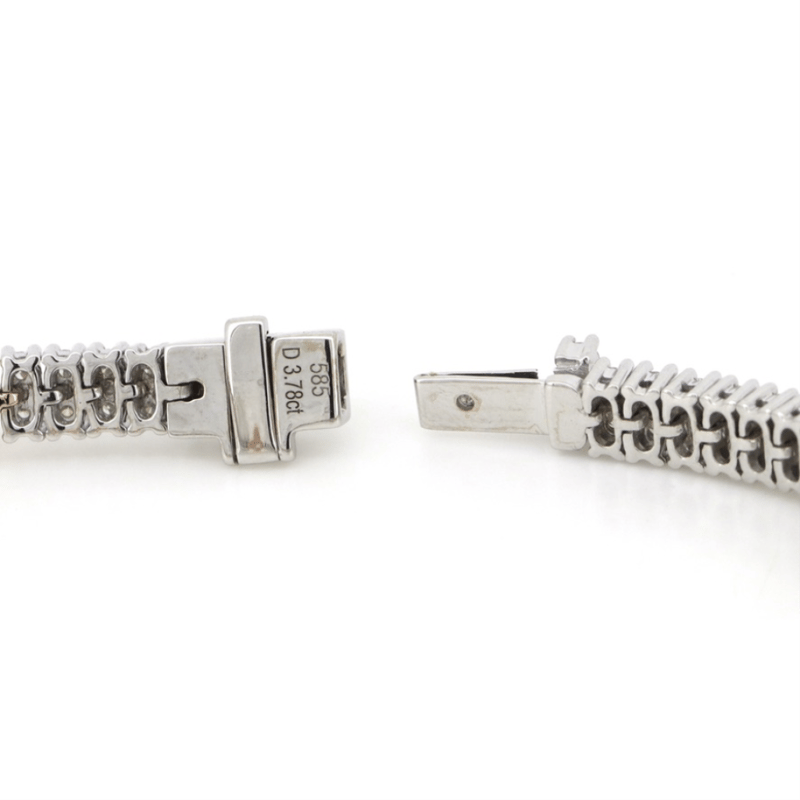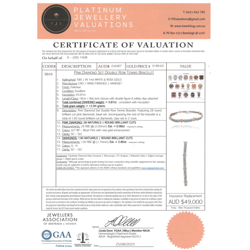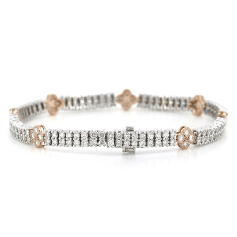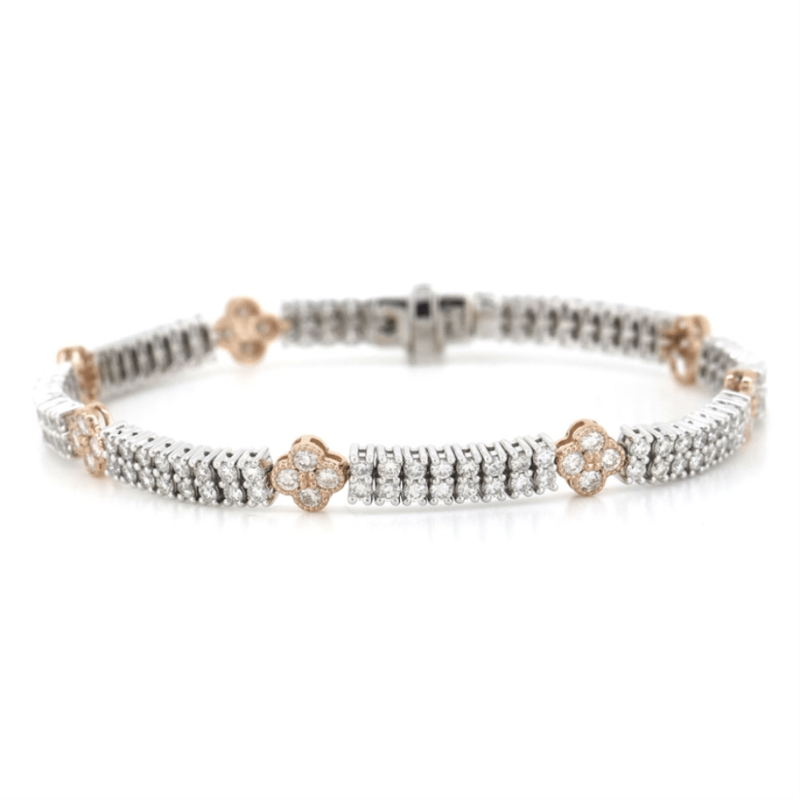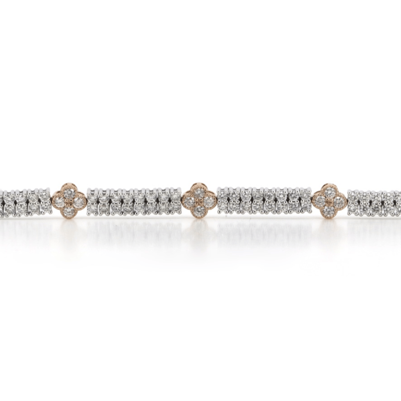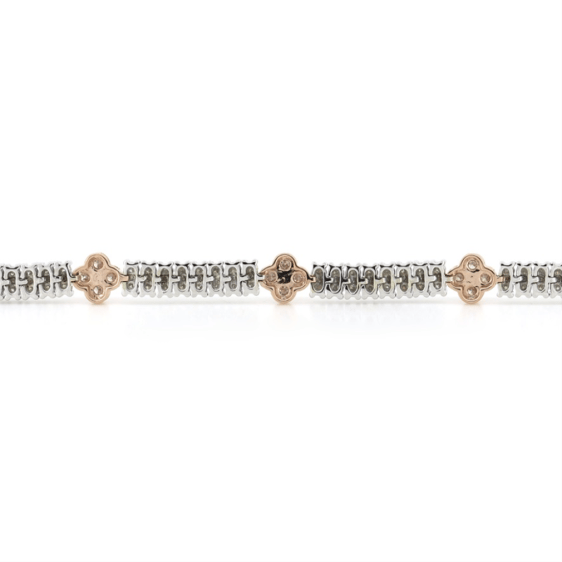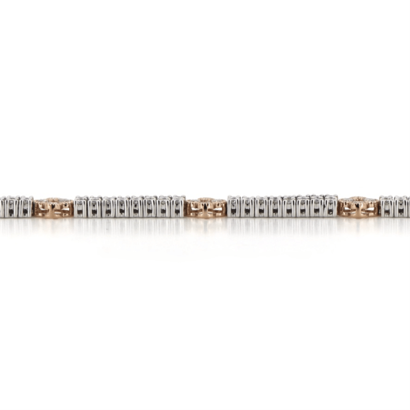 14K WHITE/ROSE GOLD, PINK DIAMOND AND DIAMOND, DECORATIVE LINE BRACELET. THE DESIGN FEATURES, 28 ROUND BRILLIANT CUT, BLUSH PINK, DIAMONDS (0.98CT TDW, 6/7 BLUSH PINK, SI1-SI2 CLARITY), BEAD SET IN ROSE GOLD IN A CLOVER STYLE SETTING. EMBELLISHING THE DESIGN ARE, 130 ROUND BRILLIANT CUT, DIAMONDS (2.80CT TDW, G-H COLOUR, SI1-SI2 CLARITY), MICRO-CLAW SET IN WHITE GOLD. THE BRACELET HAS A BOX LOCK CLASP WITH A HINGED SAFETY LATCH. BRACELET LENGTH IS 18CM.