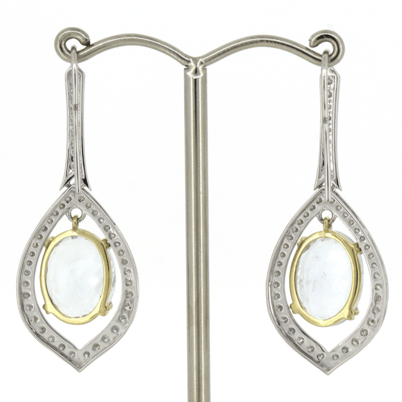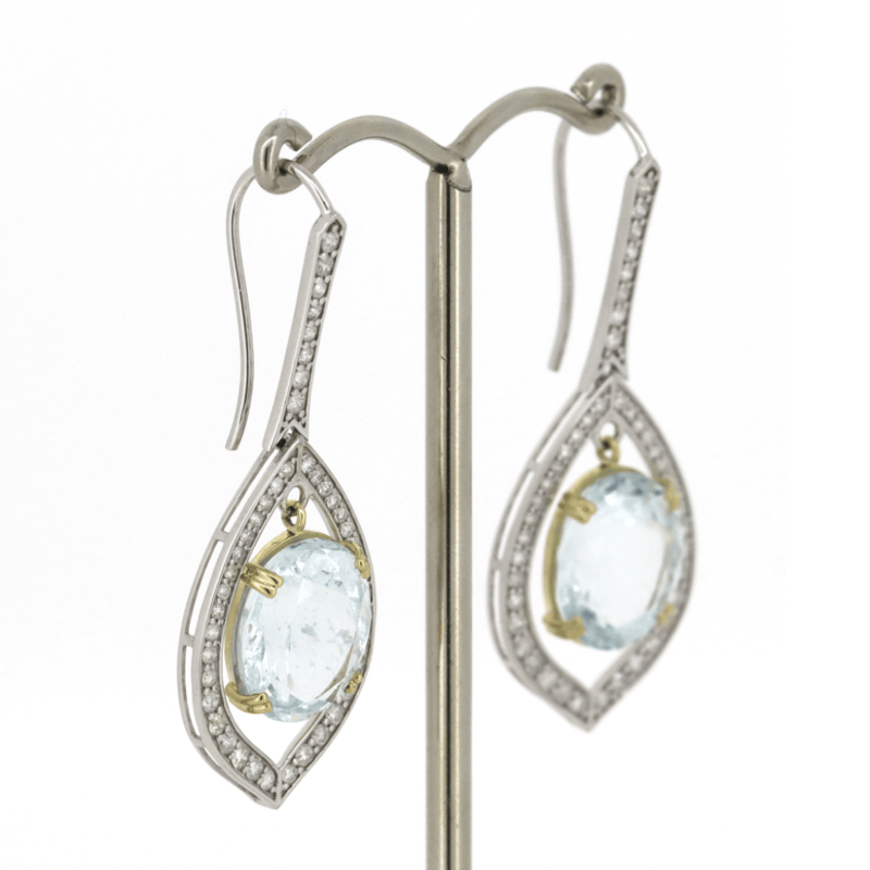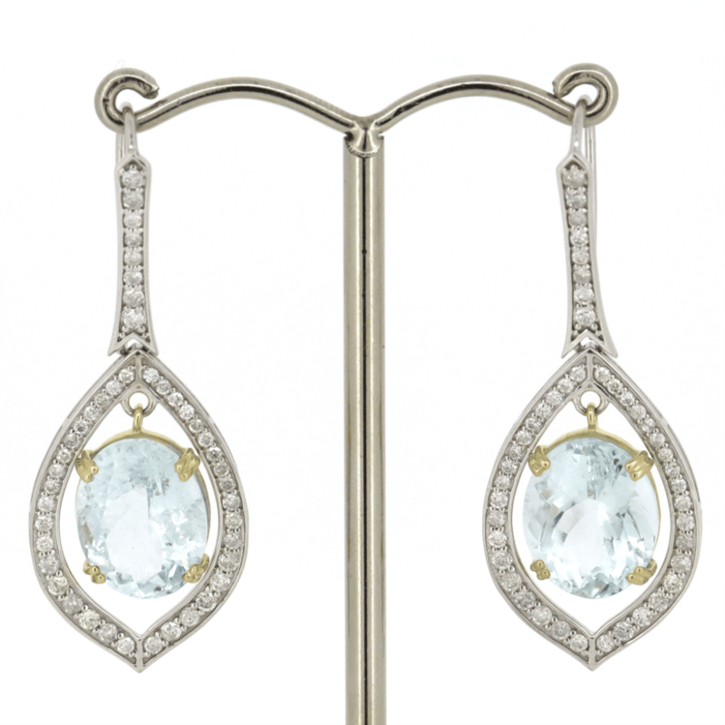 14K WHITE/YELLOW GOLD, AQUAMARINE AND DIAMOND, HALO DROP EARRINGS. THE EARRINGS FEATURE, 2 OVAL FACETED CUT, LIGHT BLUE, AQUAMARINES (9.42CT TSW, LIGHT-MODERATE NATURAL INCLUSIONS), CLAW SET IN YELLOW GOLD. ENCOMPASSING THE CENTRE AND DECORATING THE HOOKS ARE, 88 ROUND BRILLIANT CUT, DIAMONDS (0.89CT TDW, H-J COLOUR, SI-I2+ CLARITY), BEAD SET. THE EARRINGS FEATURE SHEPHERD HOOKS IN WHITE GOLD. Valuations Provided by an Independent Third-Party Professional Not Directly Associated With Lloyds Auctions at AUD $16500This valuation has been conducted by an independent third-party professional. The valuation amount is an assessment by the issuing valuer and does not reflect the auction value of the item. Any inquiries regarding the valuation should be directed to the issuing valuer (refer to contact details on the certificate), as Lloyds Auctions has no affiliation or influence over the valuation, the valuer, or the stated amount. Condition: Good - Refer Images 0645866+99