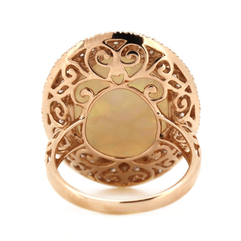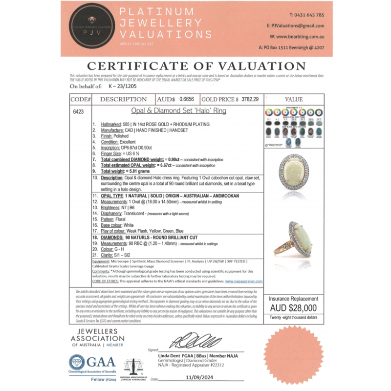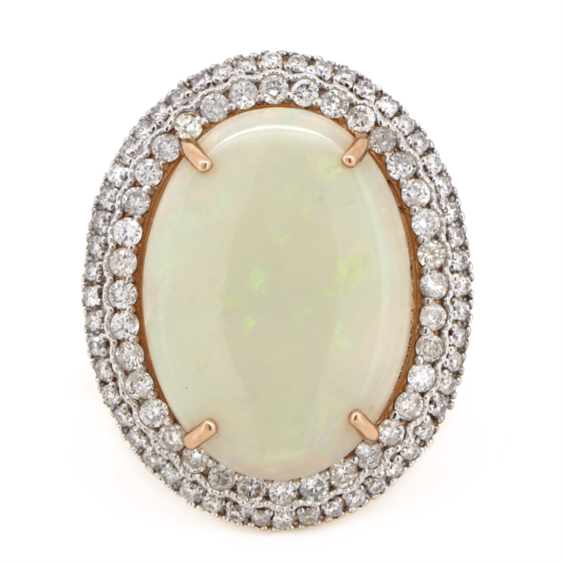 14K WHITE GOLD, 6.67CT ANDAMOOKA OPAL AND DIAMOND, STATEMENT RING. THE CENTRE FEATURES, ONE OVAL CABOCHON CUT, ANDAMOOKA OPAL (6.67CT, STRONG COLOUR PLAY OF ORANGE, RED AND GREEN- BRIGHTNESS N7-B6 ), CLAW SET. SURROUNDING THE CENTRE IN A DOUBLE HALO AND DECORATING SHOULDERS ARE, 90 ROUND BRILLIANT CUT, DIAMONDS (0.90CT TDW, G-H COLOUR, SI1-SI2 CLARITY), SEMI BEZEL/BEAD SET. RING SIZE N.