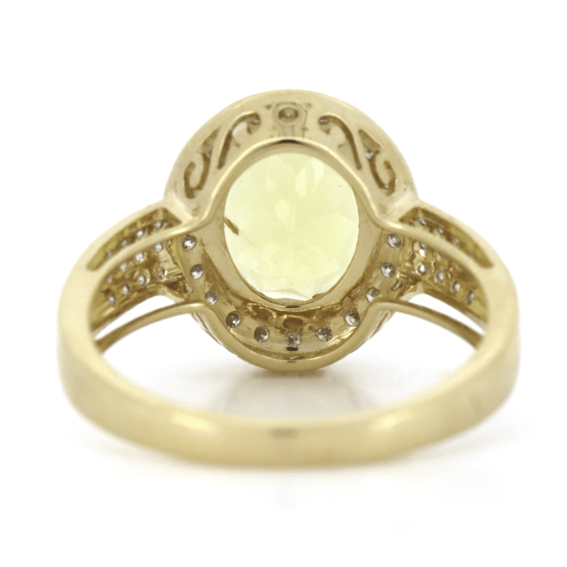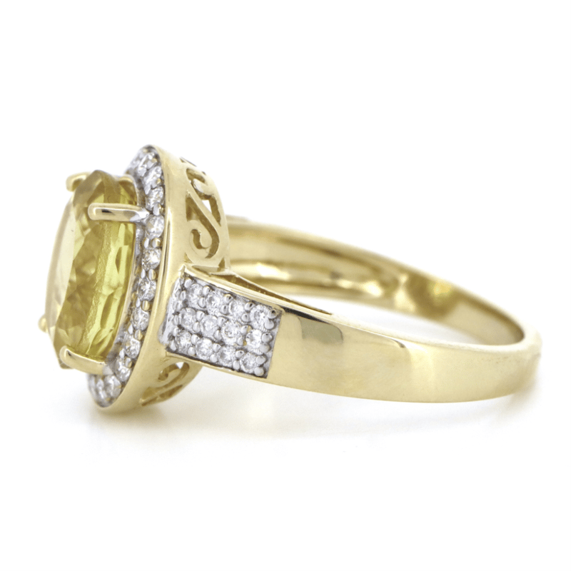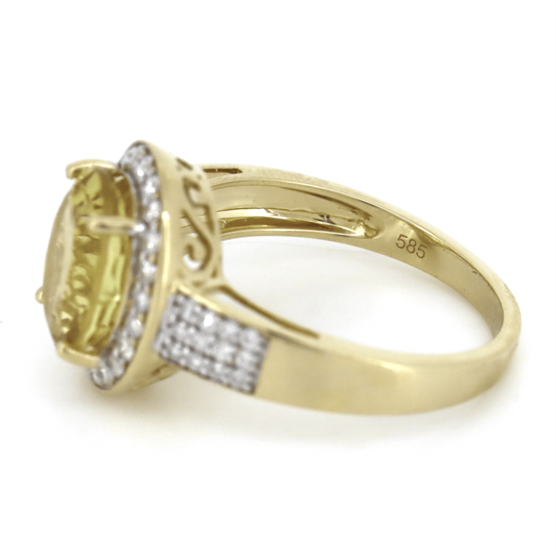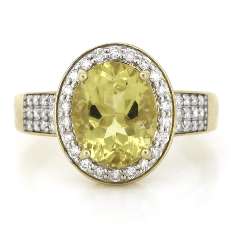 14K YELLOW GOLD, HELIODOR AND DIAMOND, HALO TRIPLE ROW BAND RING. THE CENTRE FEATURES, ONE OVAL CUT, GOLDEN YELLOW, HELIODOR (2.52CT, EYE CLEAN CLARITY), 4 CLAW SET. SURROUNDING THE CENTRE IN A HALO AND DECORATING THE BAND ARE, 46 ROUND BRILLIANT CUT, DIAMONDS (0.33CT TDW, G-J COLOUR, SI-I2+ CLARITY), BEAD SET. RING SIZE M 1/2. Valuations Provided by an Independent Third-Party Professional Not Directly Associated With Lloyds Auctions at AUD $11800This valuation has been conducted by an independent third-party professional. The valuation amount is an assessment by the issuing valuer and does not reflect the auction value of the item. Any inquiries regarding the valuation should be directed to the issuing valuer (refer to contact details on the certificate), as Lloyds Auctions has no affiliation or influence over the valuation, the valuer, or the stated amount. Condition: Good - Refer Images 0645866+59