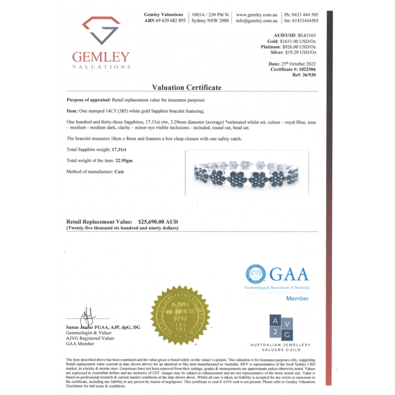 14K WHITE GOLD, BLUE SAPPHIRE, FLORAL BRACELET. THE DESIGN FEATURES, 133 ROUND CUT, ROYAL BLUE, SAPPHIRES (17.31CT TSW, MINOR EYE VISIBLE INCLUSIONS), BEAD SET. THE BRACELET HAS BOX CLASP, WITH SAFETY LATCH. BRACELET LENGTH 18CM.