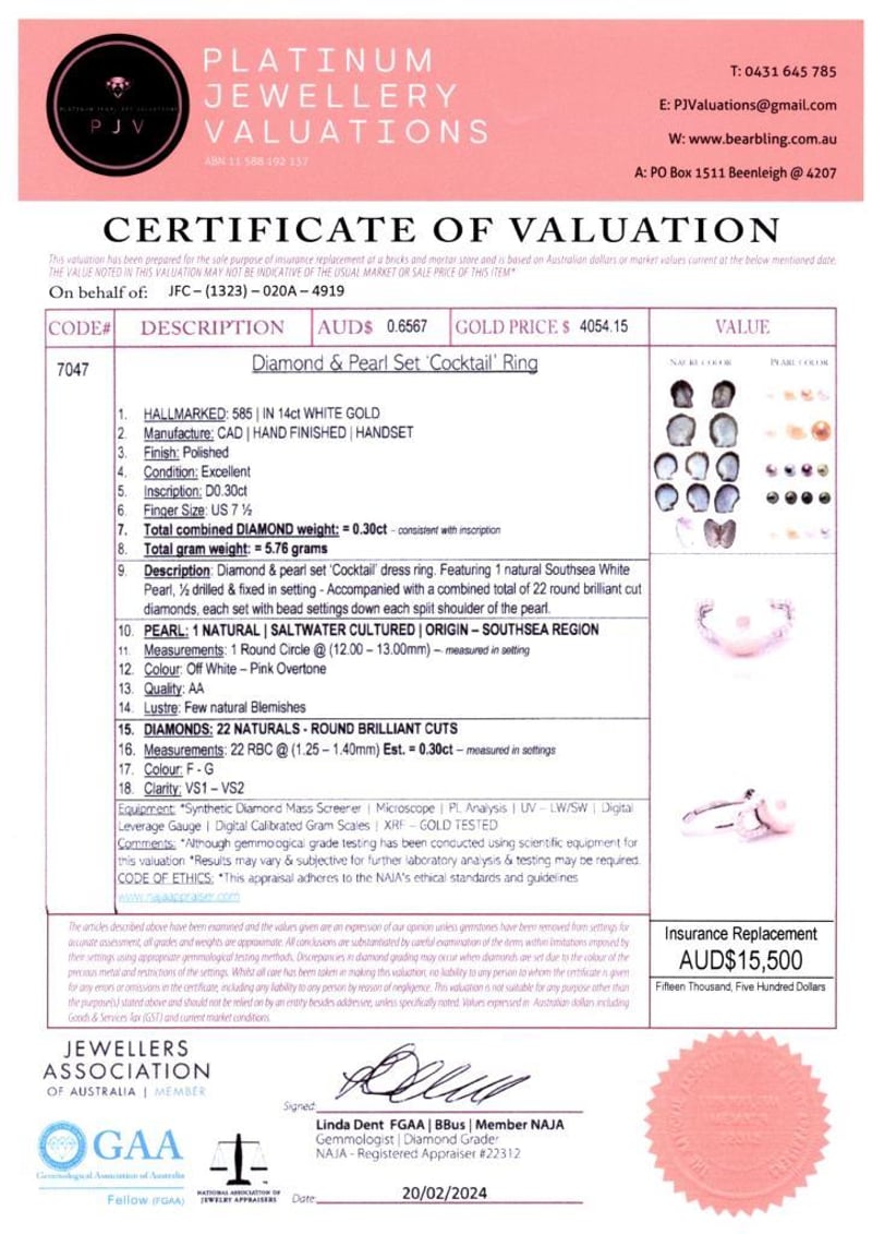 14CT WHITE GOLD PEARL AND DIAMOND COCKTAIL RING FEATURING CENTRE, ONE ROUND, OFF-WHITE/PINK CULTURED SOUTH SEA PEARL (12.00-13.00MM SIZE, AA GRADE), POST SET, WITH 22 ROUND BRILLIANT CUT DIAMONDS (0.30CT TDW, F-G COLOUR, VS1-VS2 CLARITY), BEAD SET. RING SIZE O. Valuations Provided by an Independent Third-Party Professional Not Directly Associated With Lloyds Auctions at AUD $15500This valuation has been conducted by an independent third-party professional. The valuation amount is an assessment by the issuing valuer and does not reflect the auction value of the item. Any inquiries regarding the valuation should be directed to the issuing valuer (refer to contact details on the certificate), as Lloyds Auctions has no affiliation or influence over the valuation, the valuer, or the stated amount. Condition: Good - Refer Images 0586211+1365